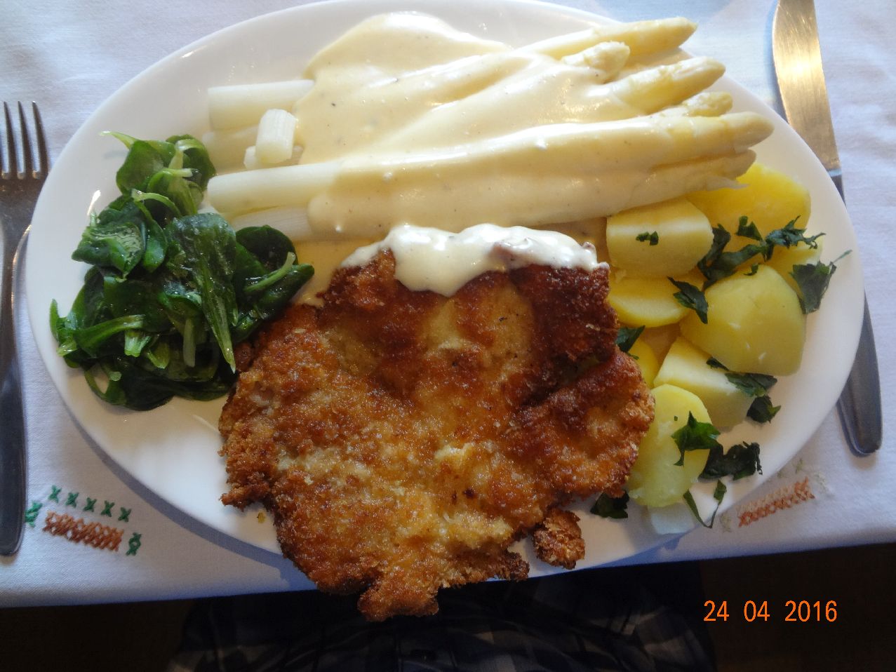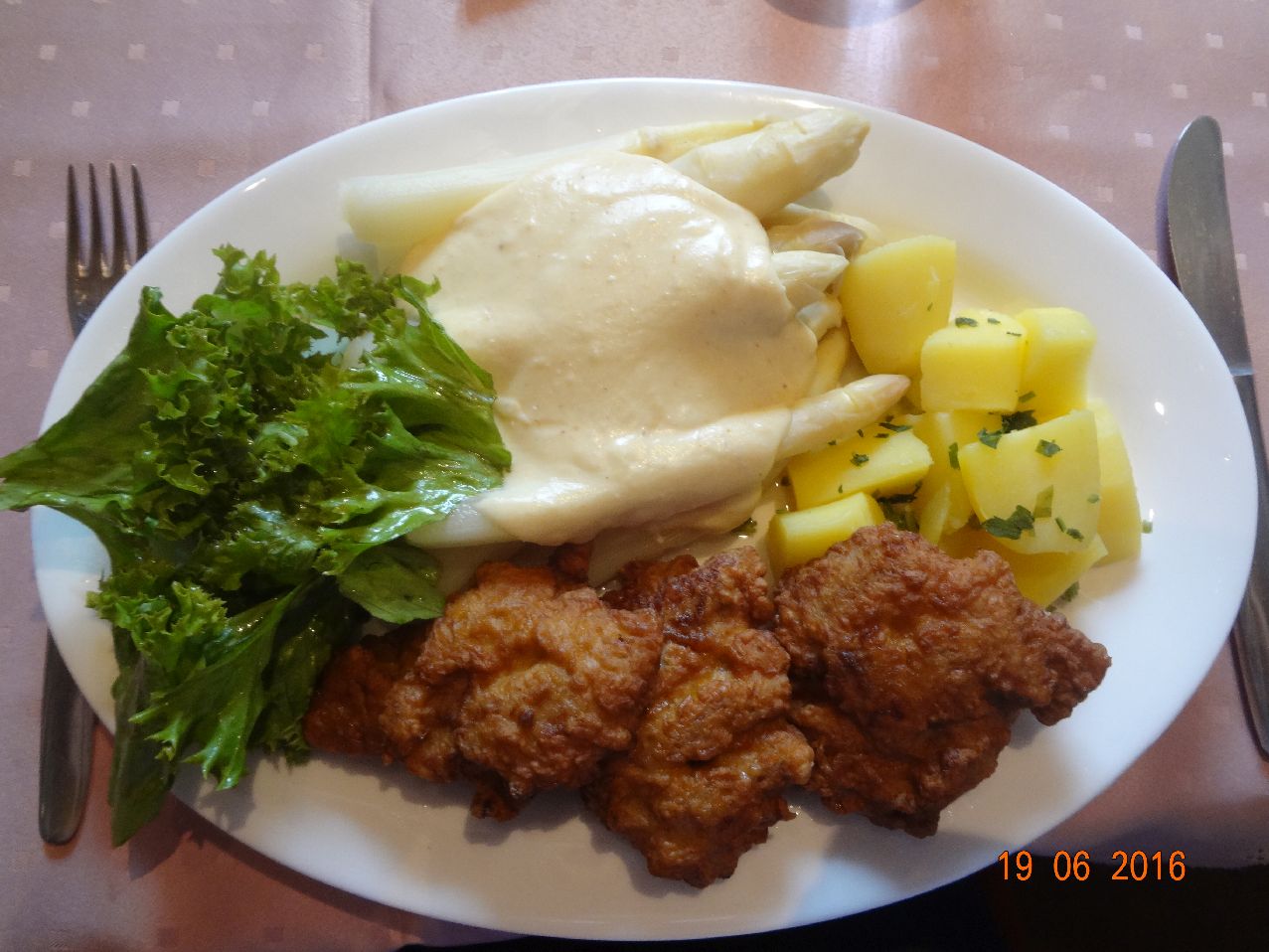 | | Hähnchen-Schnitzel mit Spargel, Pet.-Kart., Feldsalat |