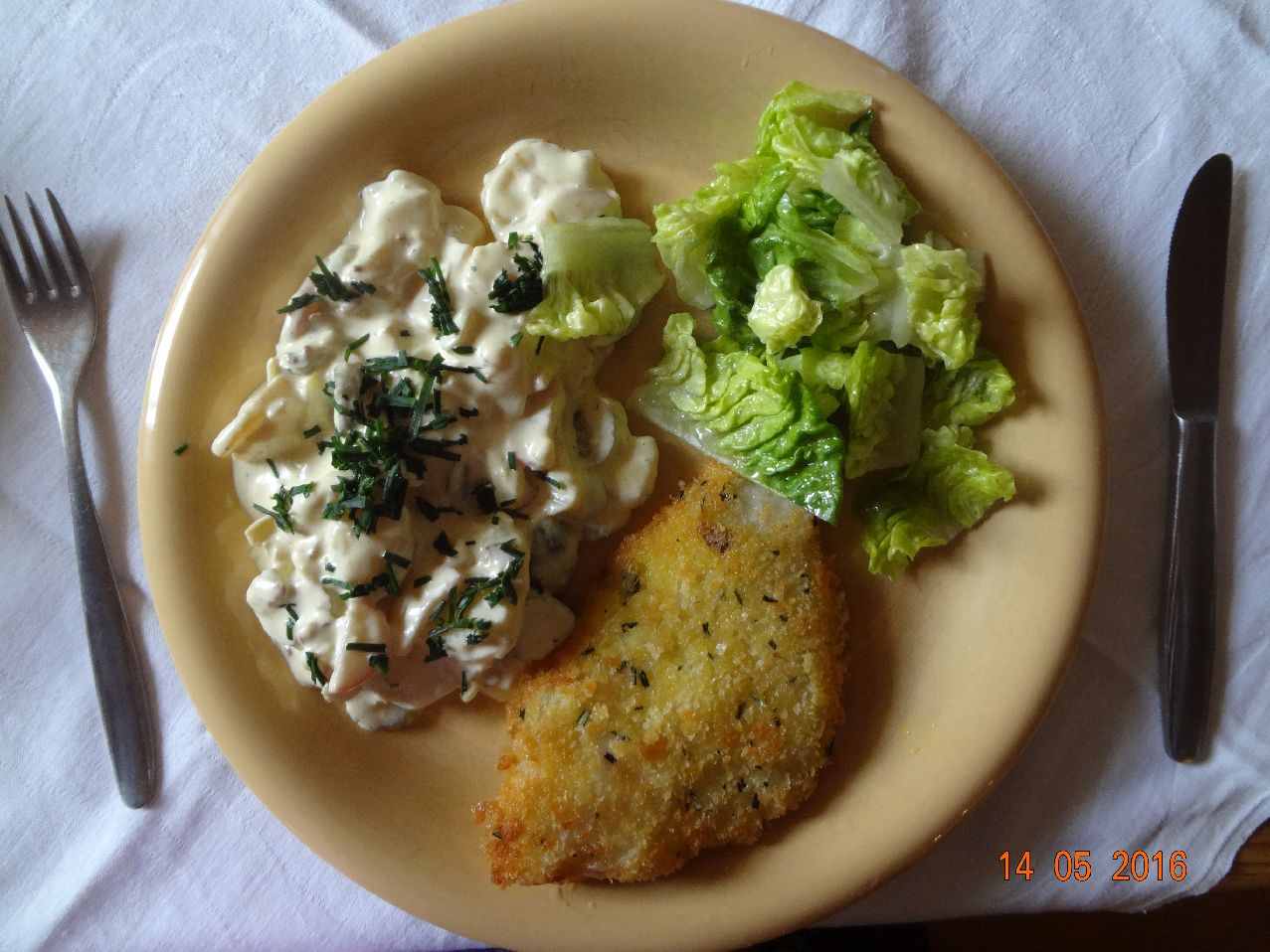 | | Gebratene Flunder mit selbstgemachtem Kartoffel-Salat, Salat |