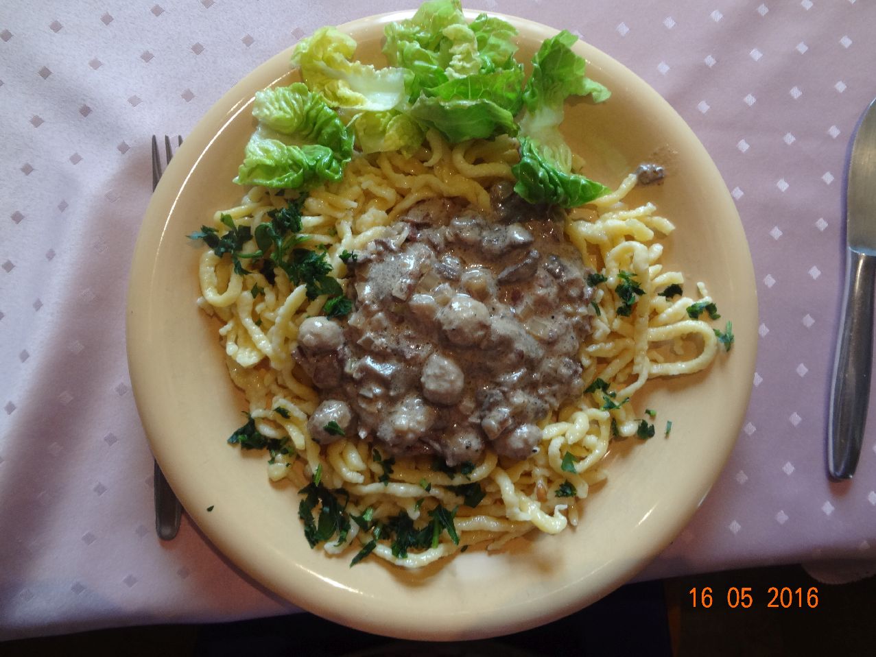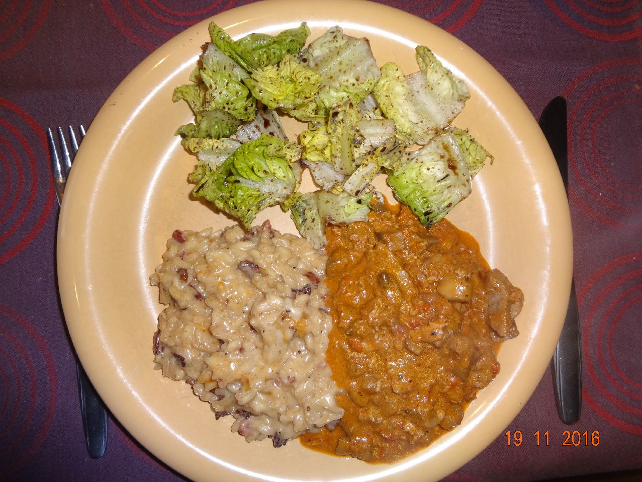 | | Rinder-Gulasch mit Pilzen, Spaghetti, Lollo-Bionda-Salat |