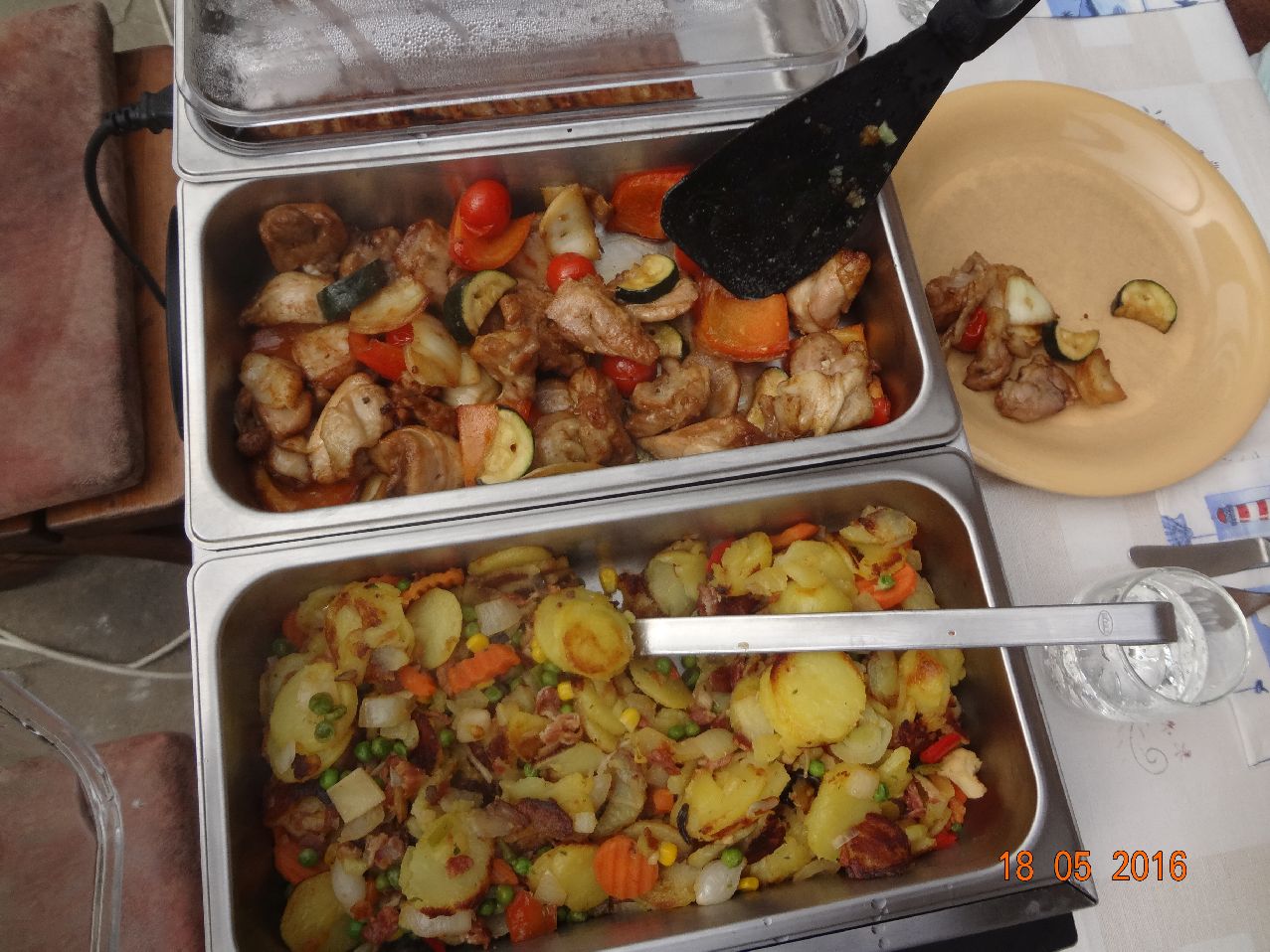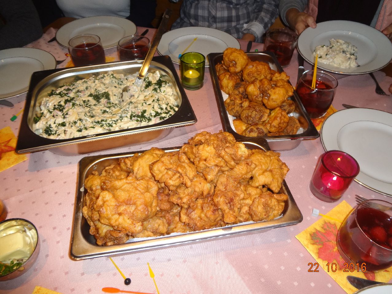 | | Hähnchen, Blumenkohl, Champignons im Schlafrock, selbstgemachter Kartoffel-Salat, Salatherzen-Salat, Möhrensalat |