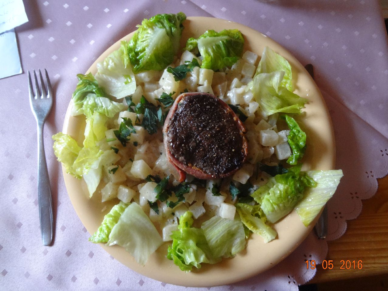 | | Mariniertes Nacken-Steak mit Kartoffeln, sehr feinen Erbsen, SalaRico-Salat |