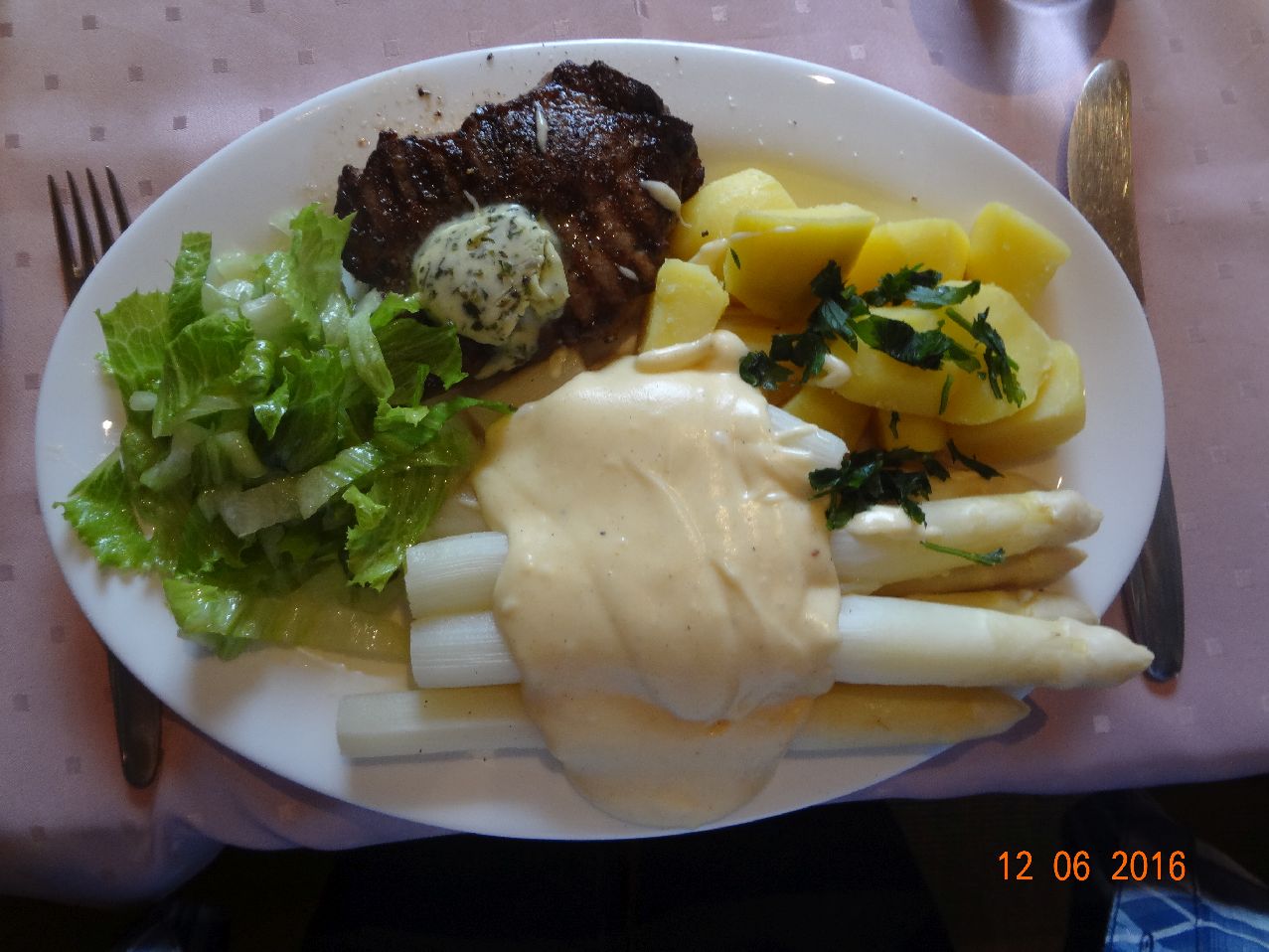 | | Nacken-Steak, Spargel, Rosm.-Kart., SalaRico |