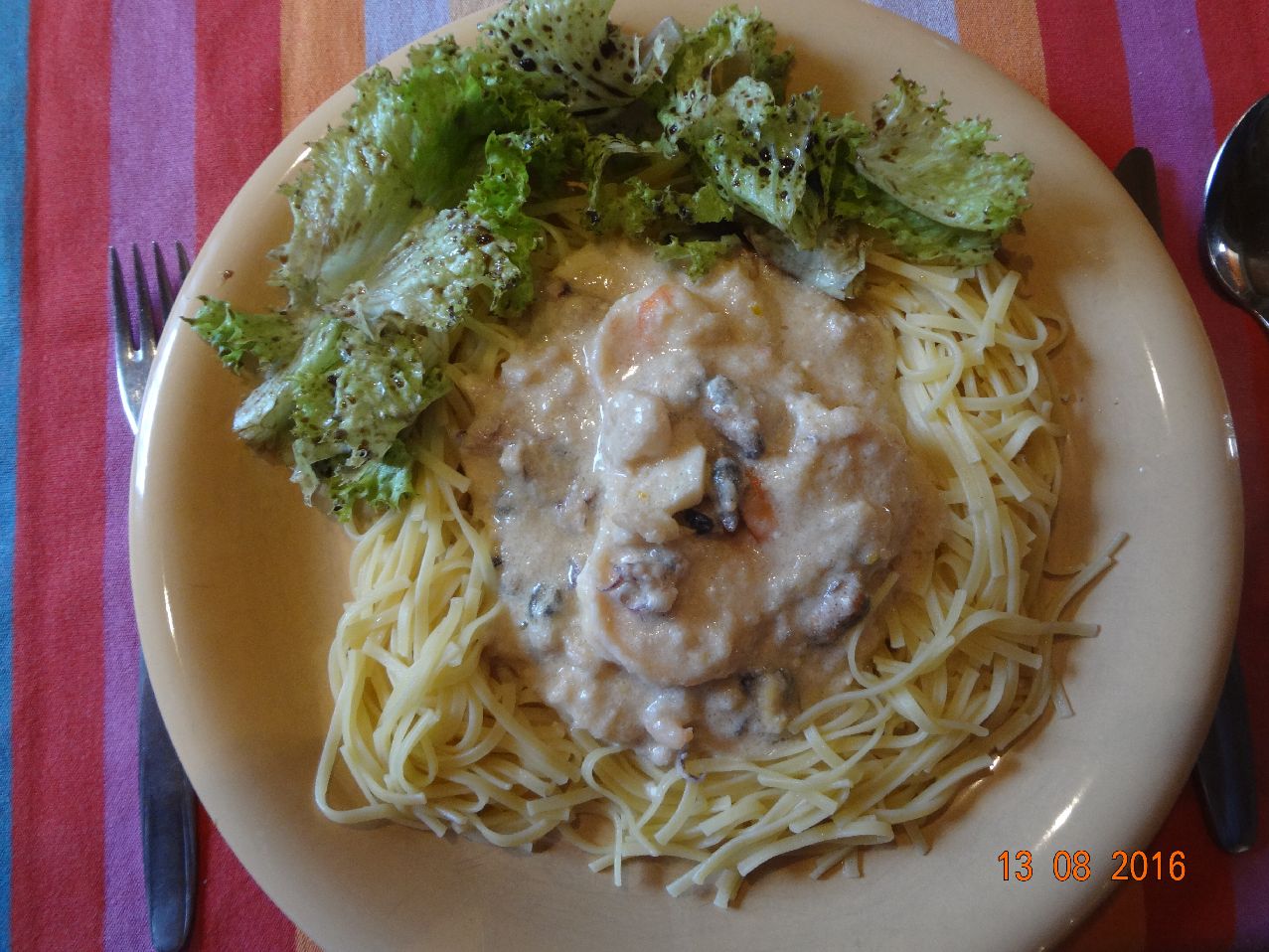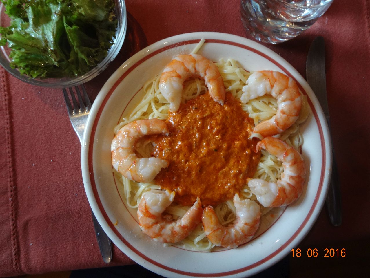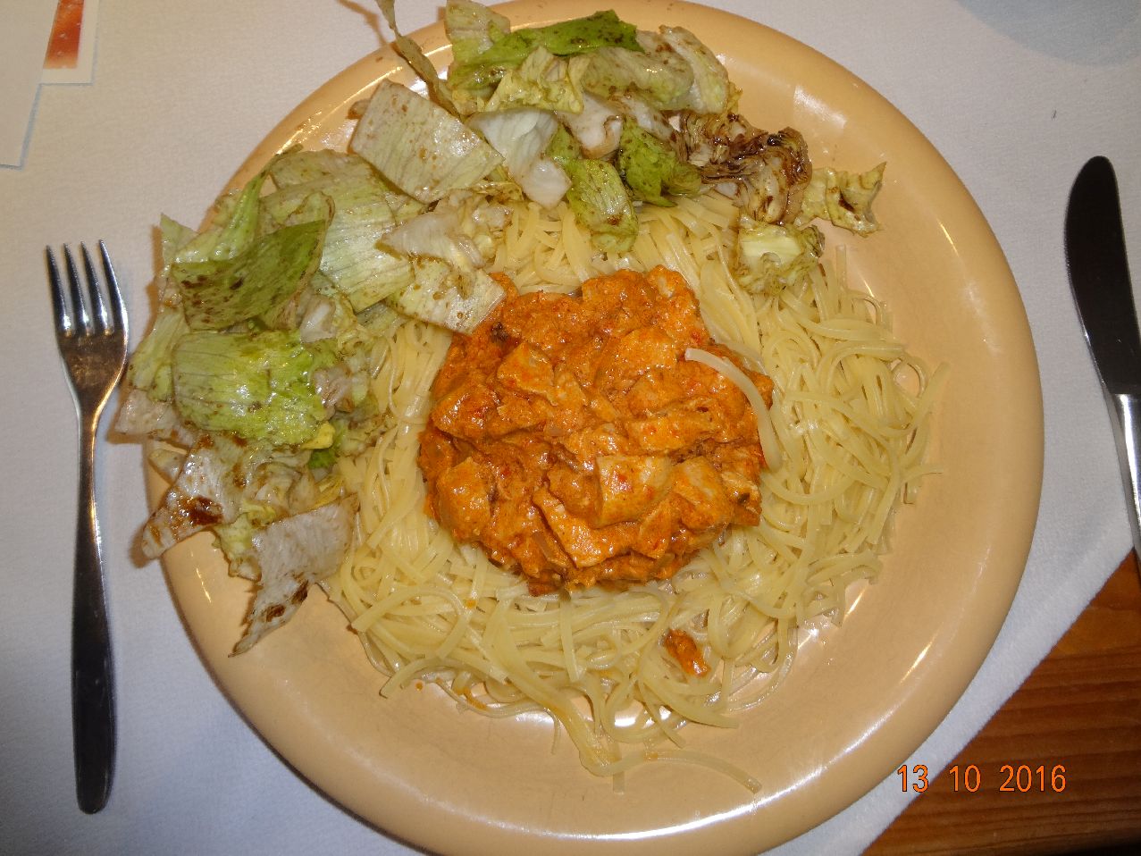 | | Spaghetti mit Meeres-Früchten, Soße aus Tomaten, Oliven, Sardellen, Petersilie, Rum und Basilikum, Eisbergsalat |
