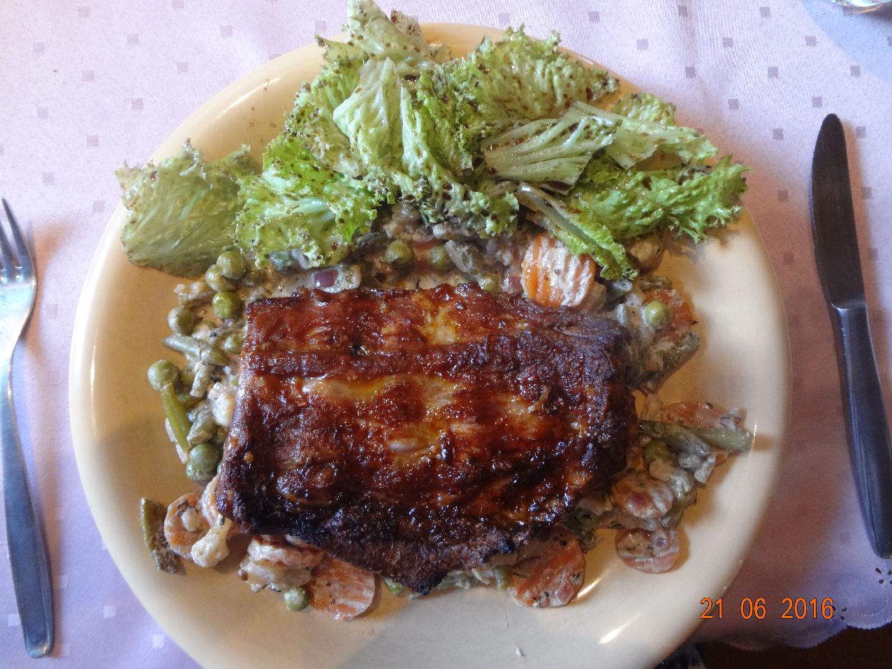 | | Gegrillte Spareribs auf Sommer-Gemüse in Weißwein-Soße, Salat |