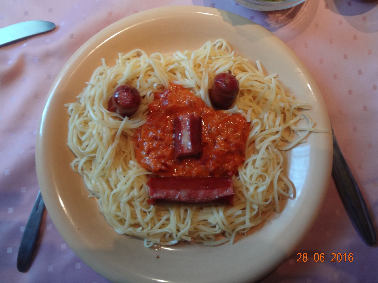 | | Gesicht aus Landnudeln mit Tomaten-Soße, Käsegriller-Würstchen |