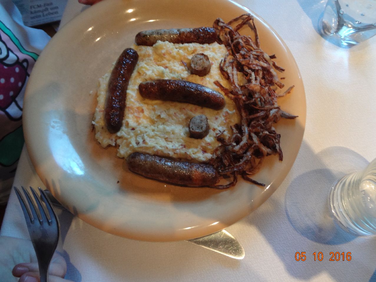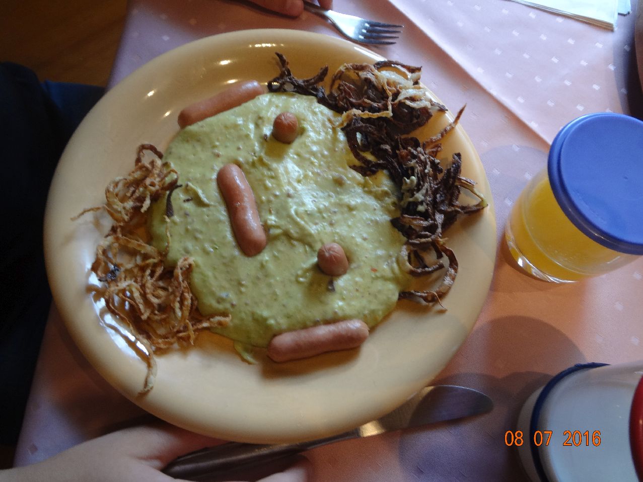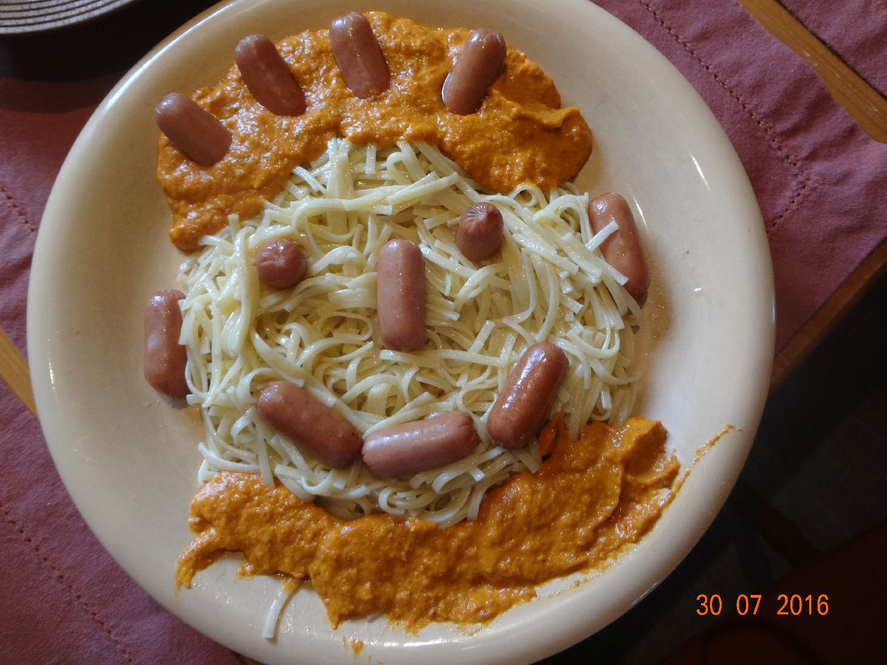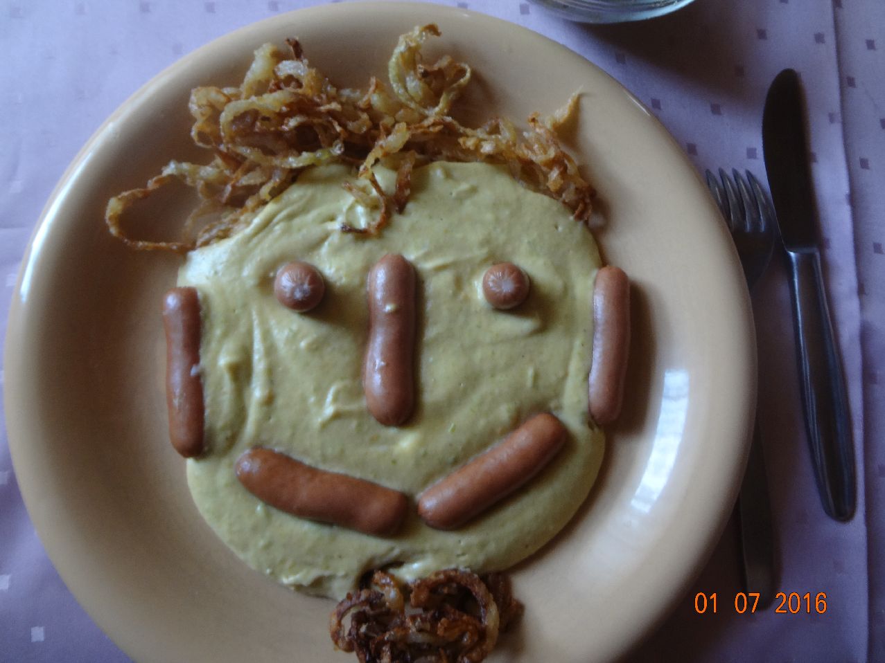 | | Gesicht aus Landnudeln, Würstchen, Gemüse-Püree-Soße |