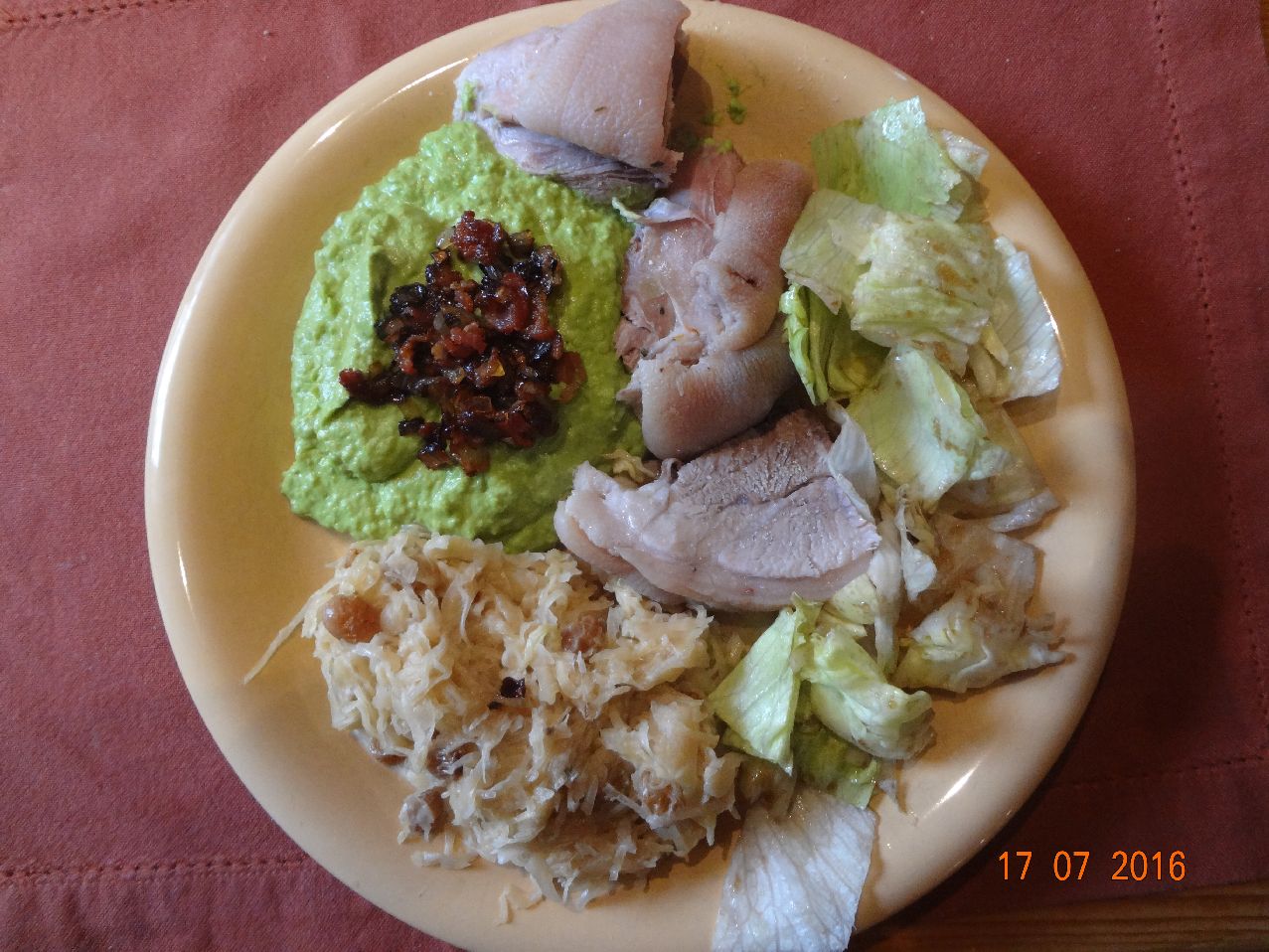 | | Eisbein, Rum-Rosinen-Sauerkraut, Erbsenpüree, Eisbergsalat |