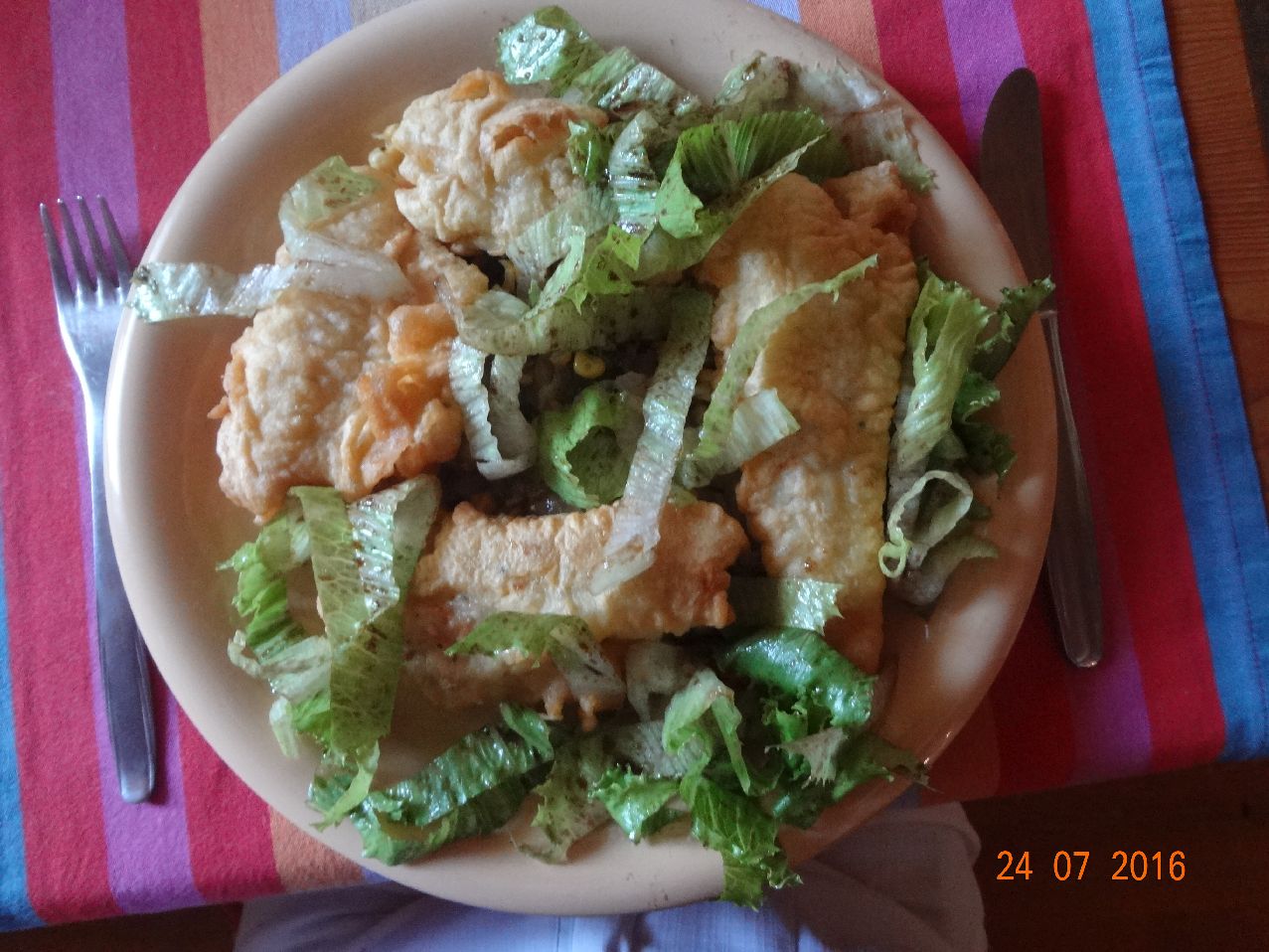 | | Zander-Filet im Bierteig auf Pfannen-Gemüse, SalaRico-Salat |