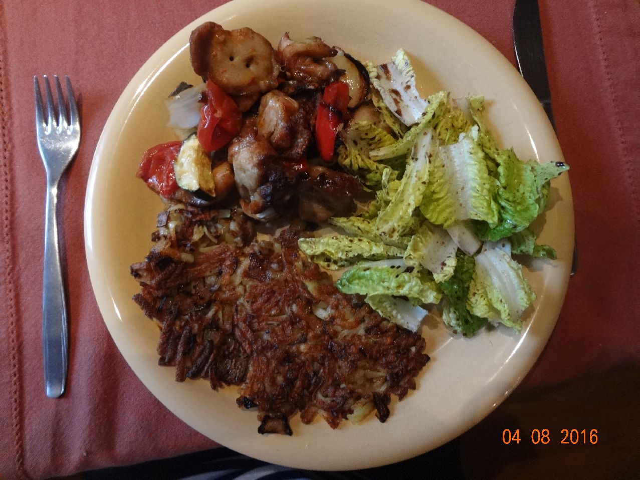 | | Hähnchen-Gemüse-Spieß, Kart.-Rösti, Mini-Bionda-Salat |