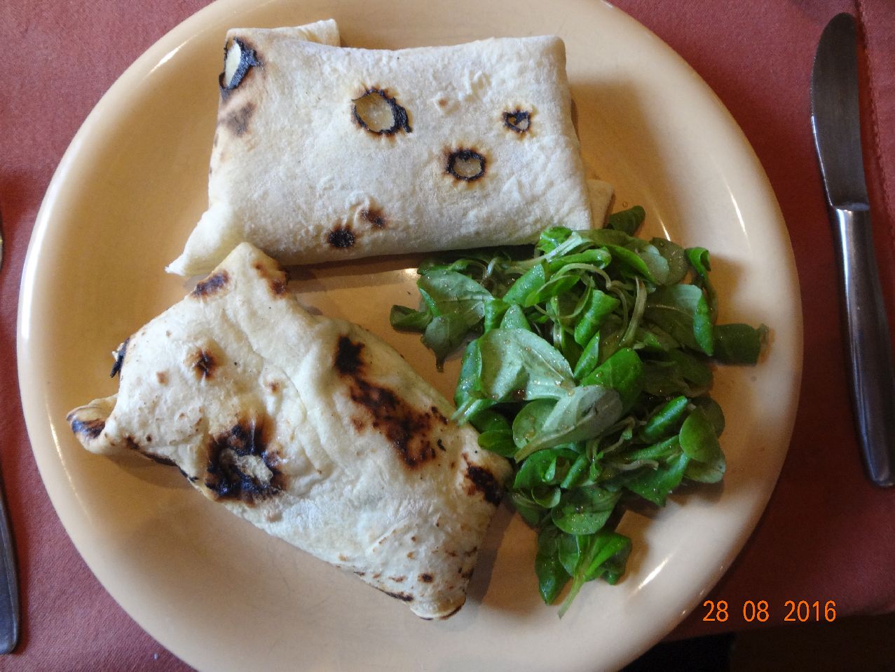 | | Lamm-Geschnetzeltes, asiatisches Pfannen-Gemüse in türkischem Fladenbrot, Feldsalat |