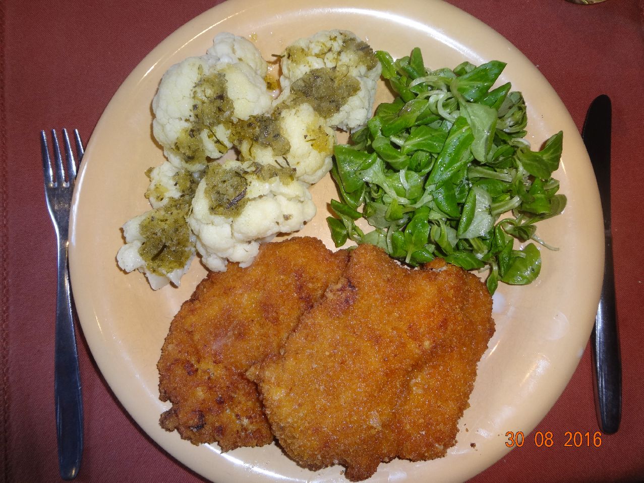 | | Schweine-Filet-Medaillons in Katoffel-Chips-Panade, Blumenkohl mit Kräuterbutter, Feldsalat |