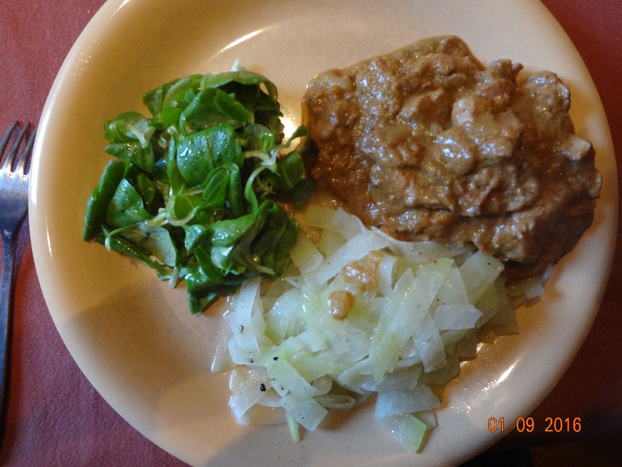 | | Falscher Hase mit Rosenkohl, Pilz-Rahm-Soße, Kart., Lollo-Bionda-Salat |