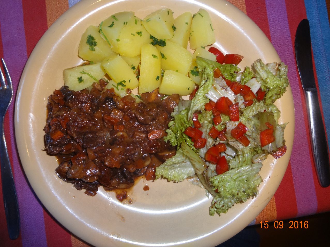 | | Känguru-Hirsch-Gulasch mit Pilzen, Rosm.-Kart., Lollo-Bionda-Salat mit Paprika |