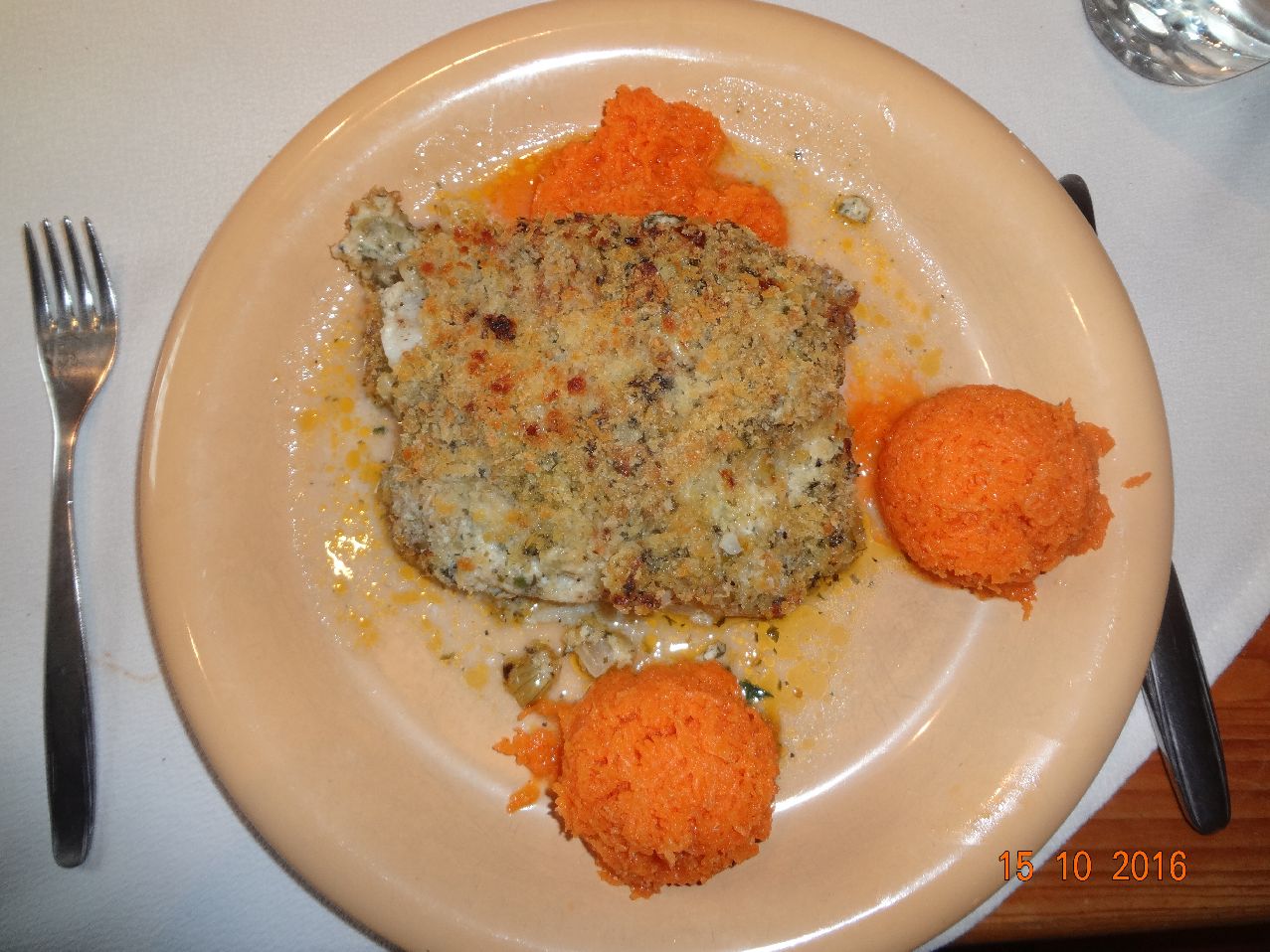 | | Zander-Filet(*), Garnele(n)*, grünen Bohnen in Kräuter-Butter, Sahne-Soße, Thymian-Kart., Möhrensalat |