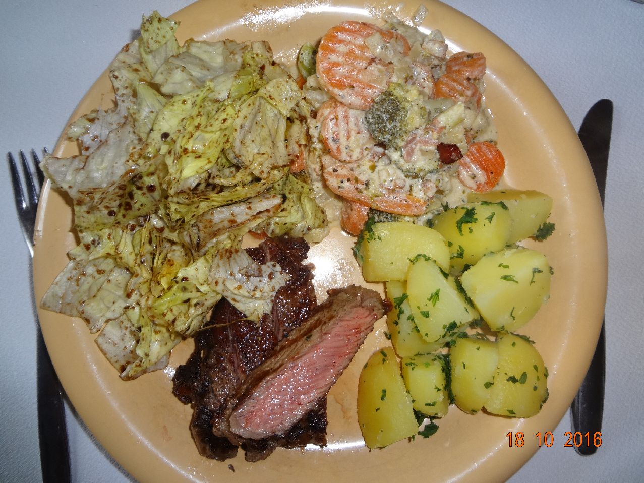 | | Nacken-Steak, Kohlrabi-Würfel in Sahne-Soße, Pet.-Kart., Möhren-Julien-Salat |