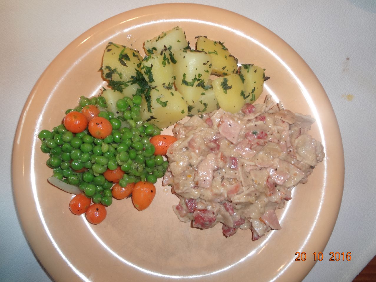 | | Fleisch-Ragout in Weißwein-Rahm-Soße mit Pet.-Kart., Leipziger Allerlei |