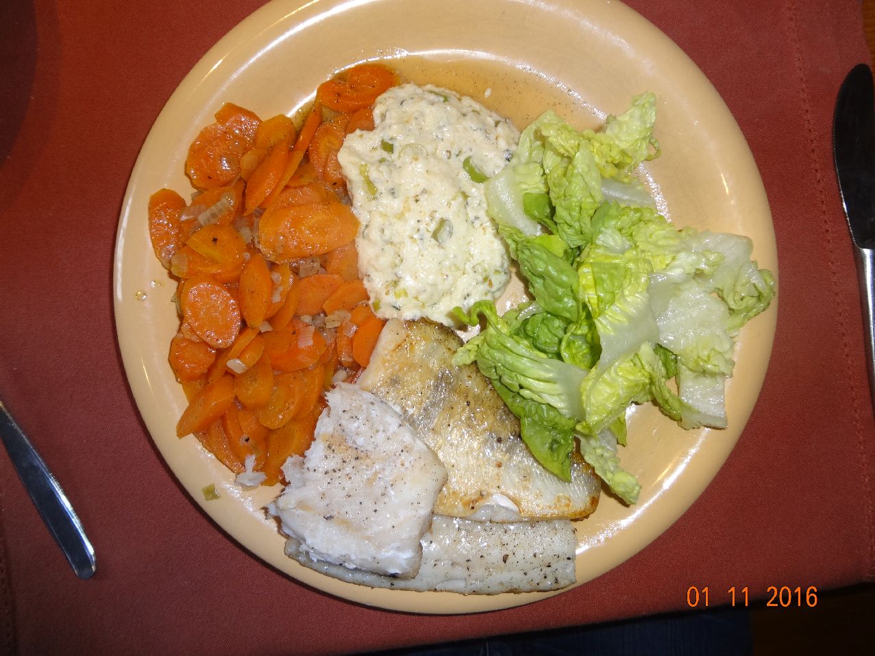 | | Rotbarsch-Filet auf Zitronen-Kartoffeln, Tomaten-Gemüse, Möhrensalat |