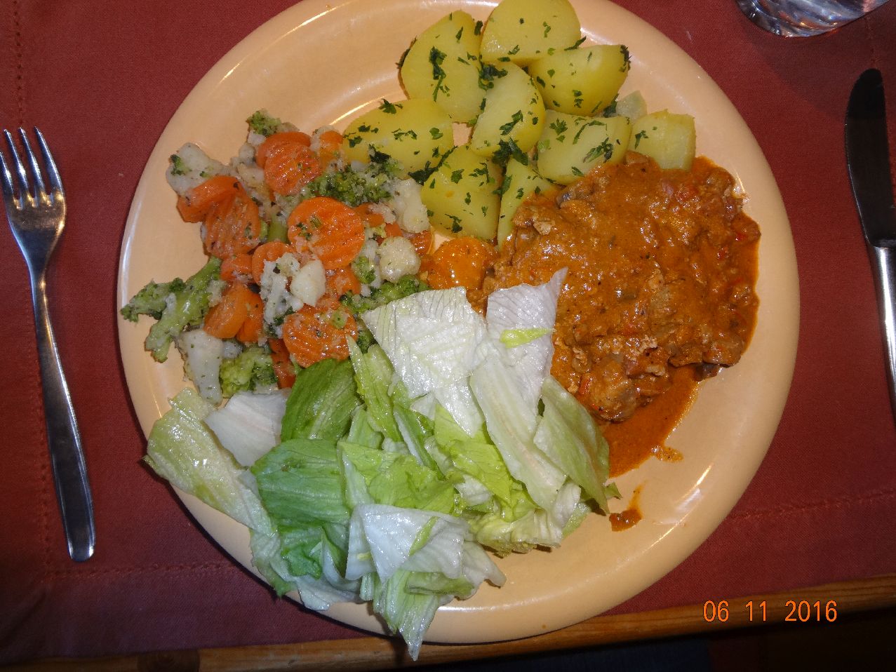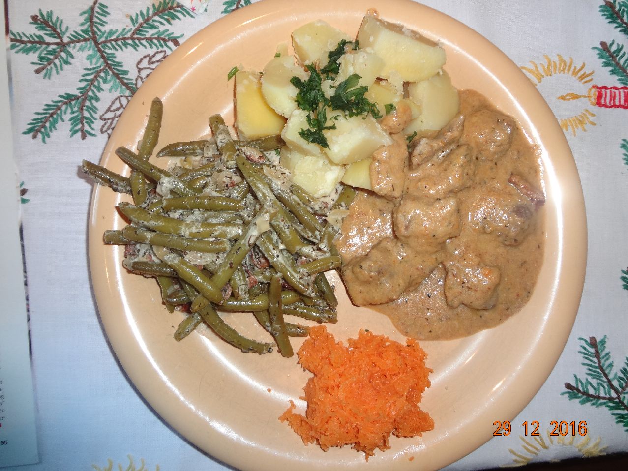 | | Gulasch, grüne Bohnen, Kartoffeln, Möhrensalat |