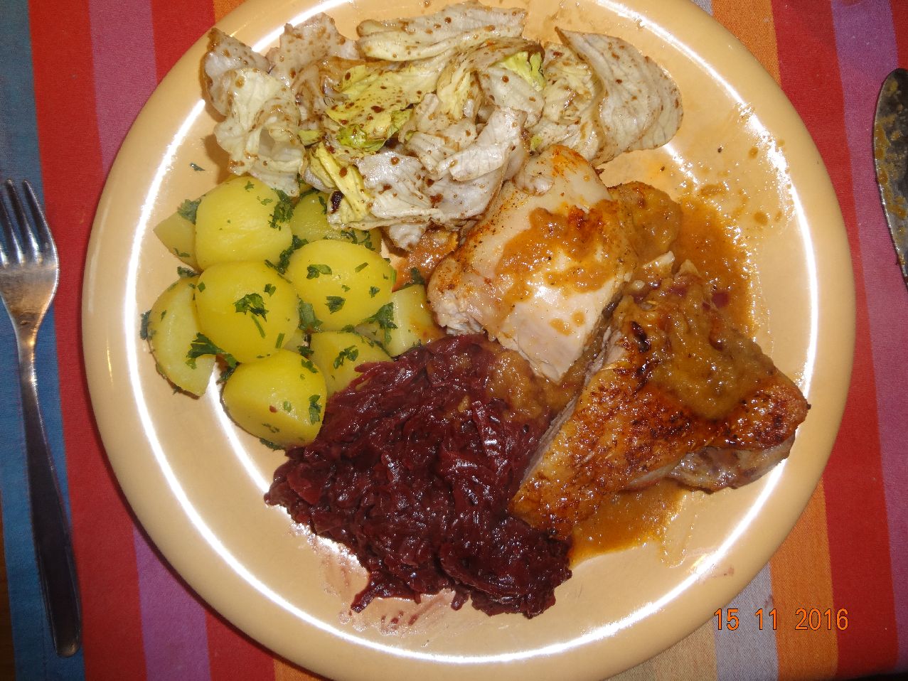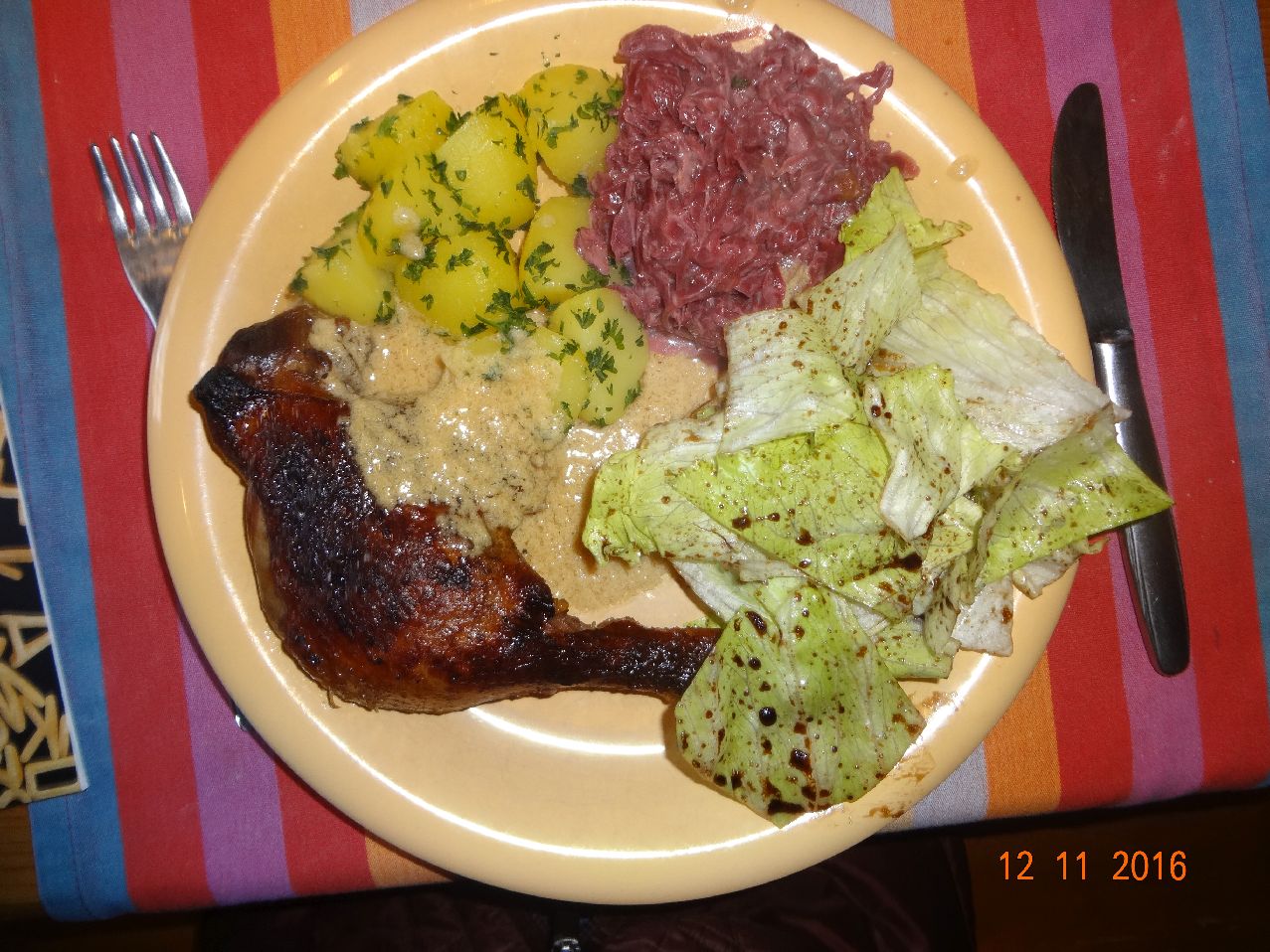 | | Geflügel-Keule mit Orangensoße, Rotkohl, Pet.-Kart., Eisbergsalat |
