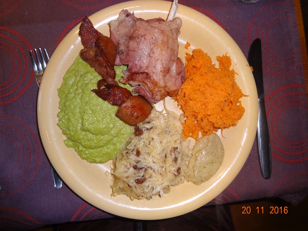 | | Gepökeltes, geräuchertes Eisbein, Erbsenpüree aus feinen Erbsen, Rum-Rosinen-Sauerkraut, Möhrensalat |
