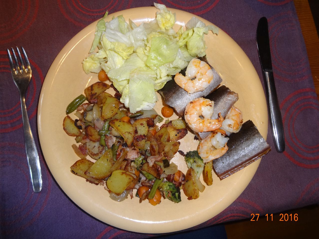 | | Räucheraal, Garnelen auf Bratkartoffeln mit Pfannen-Gemüse, Eisbergsalat |