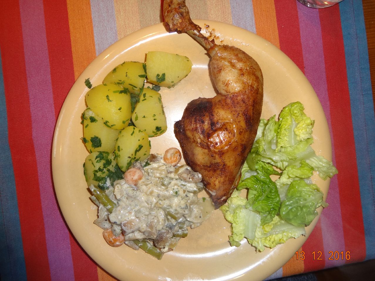 | | Enten-Keule aus dem Schnellkochtopf, grüne Bohnen, Sellerie-Karotten-Kart.-Stampf, Eisbergsalat |