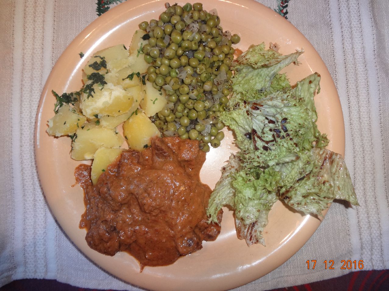 | | Rinder-Pilz-Gulasch, sehr feine Erbsen, Oregano-Pet.-Kart., Lollo-Bionda-Salat