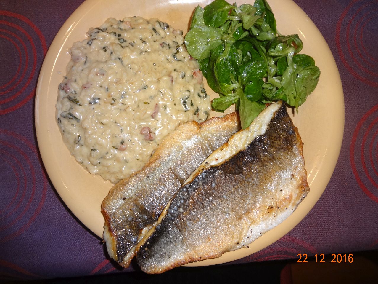 | | Gebratenes Wolfsbarsch-Filet, Basilikum-Risotto, Feldsalat |