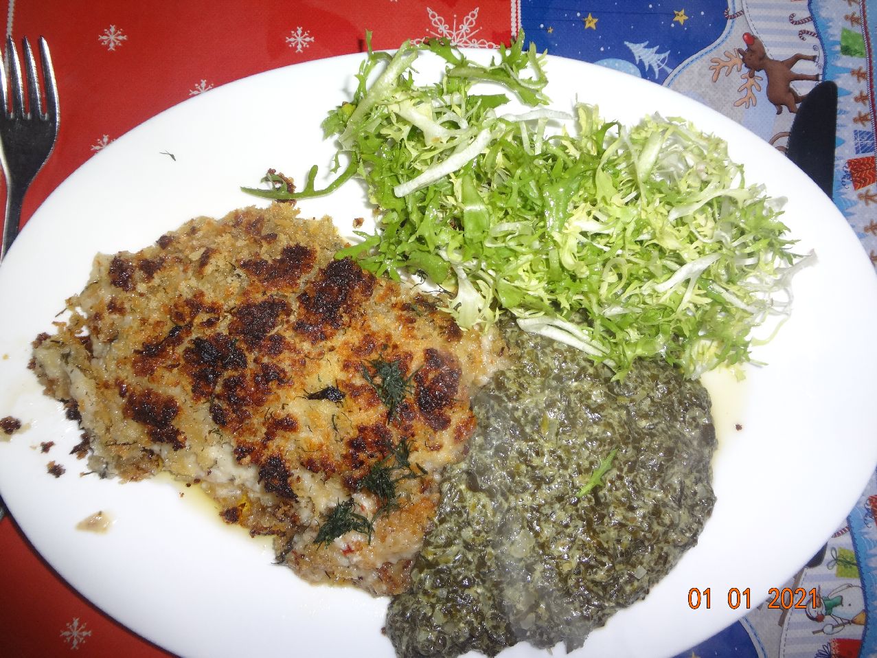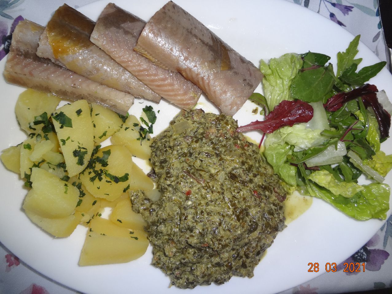 | | Räucheraal mit Spinat in Wein-Rahm-Soße, Pet.-Kart., Foglia-Salat |