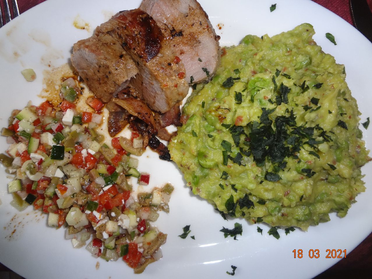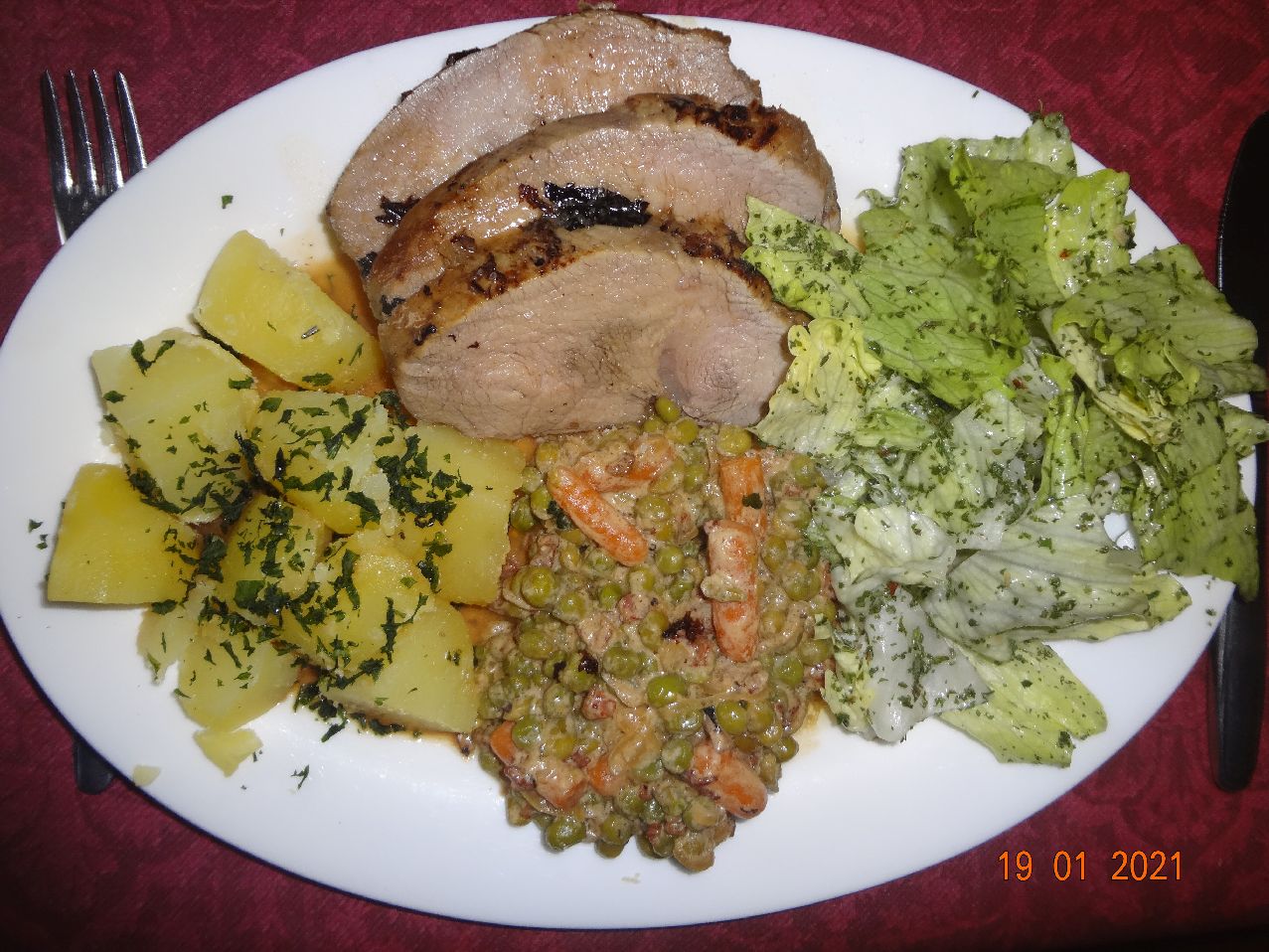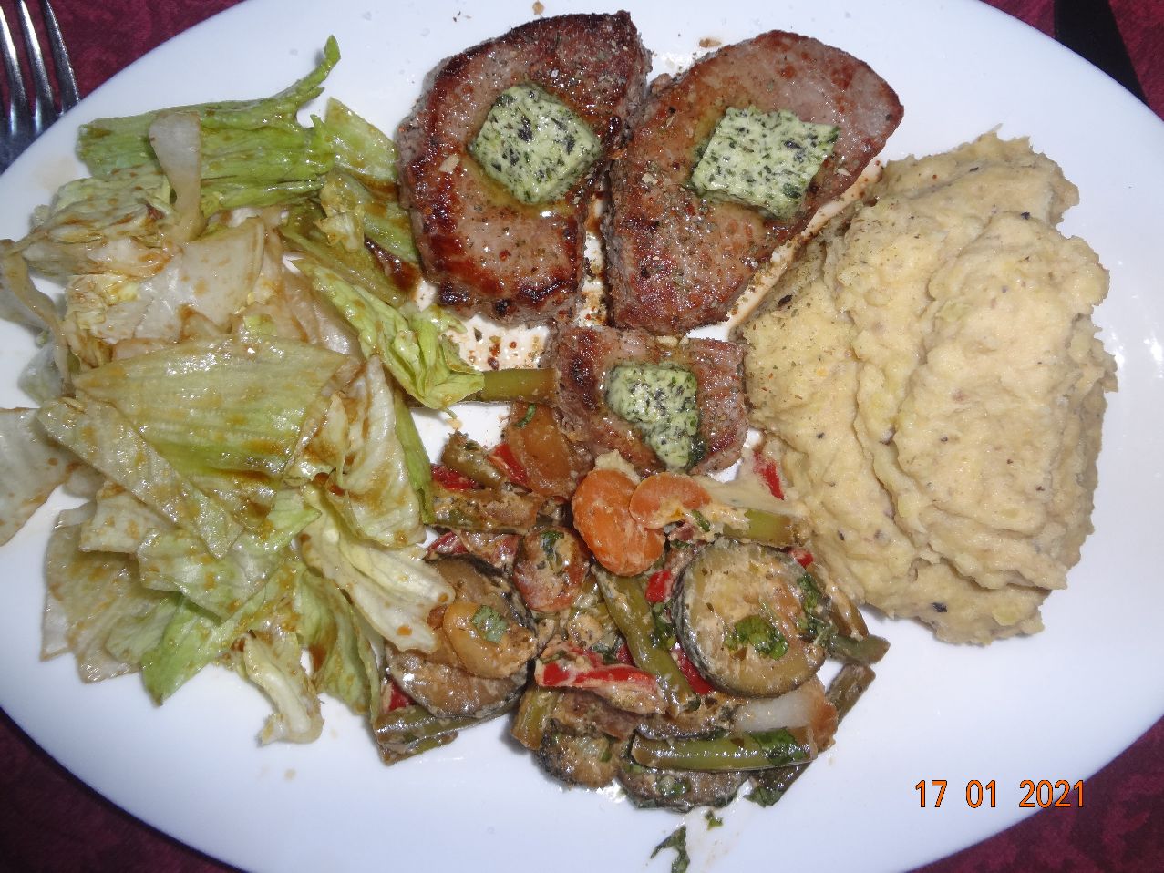 | | Wildschwein-Medaillons, Pfannen-Gemüse, Kartoffel-Püree mit Suppengrün-Püree, Eisbergsalat |