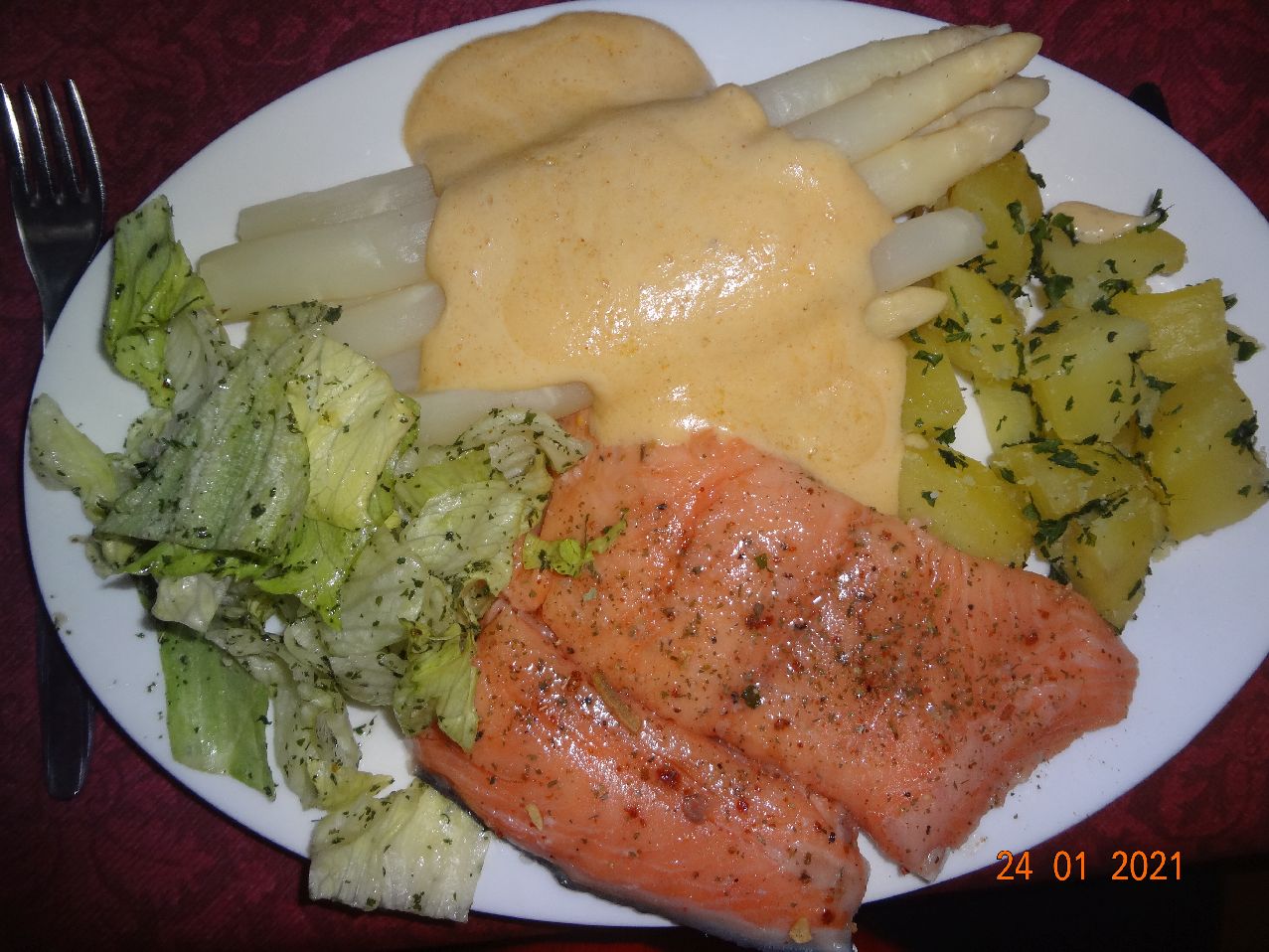 | | Spargel mit holländischer Soße, vakuumgegartes Lachs-Filet, Pet.-Kart., Eisbergsalat |