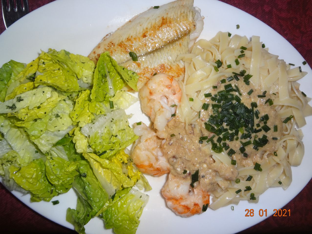 | | Scholle, Garnelen mit Tagliatella, Salatherzen |