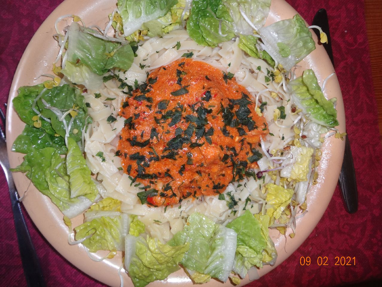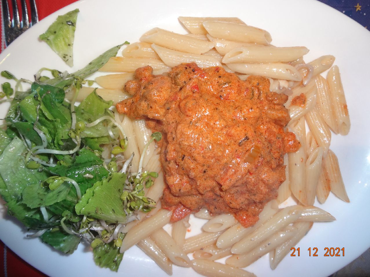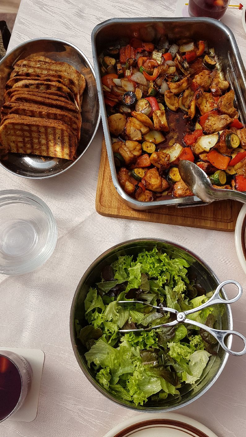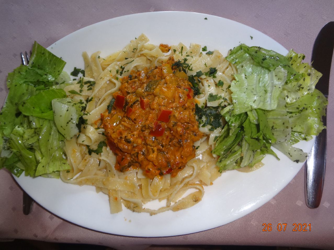 | | Pasta, Bolognese mit Ragout aus selbstgeräucherten Hähnchen-Schenkeln, Gemüse-Salat mit Mozzarella |