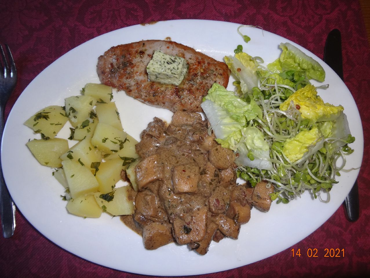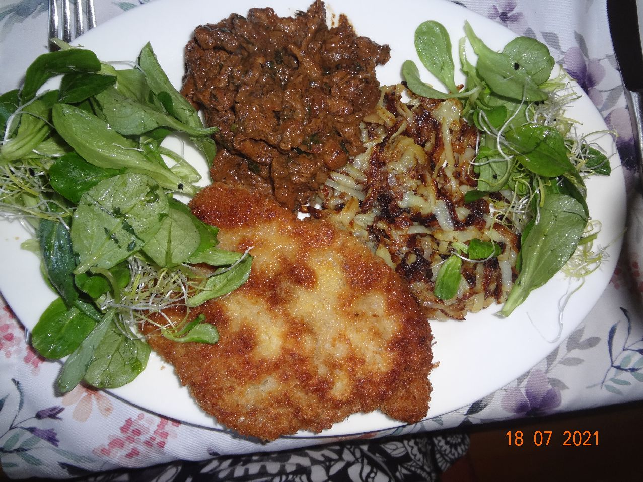 | | Schnitzel aus Schweine-Nacken, Pfifferlinge mit Steinpilz-Rahm-Wein-Soße, Apfel-Rösti, Feldsalat mit Sprossen |