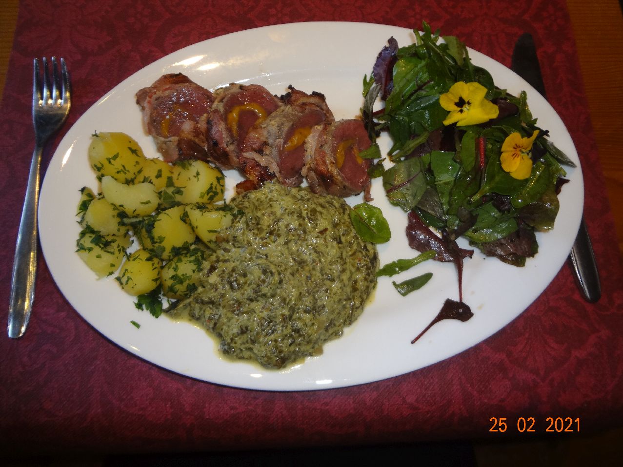 | | Mit Käse gefülltes Reh-Rücken-Filet im Speckmantel, Rahmspinat mit Blüten, Pet.-Kart., Foglia-Salat |