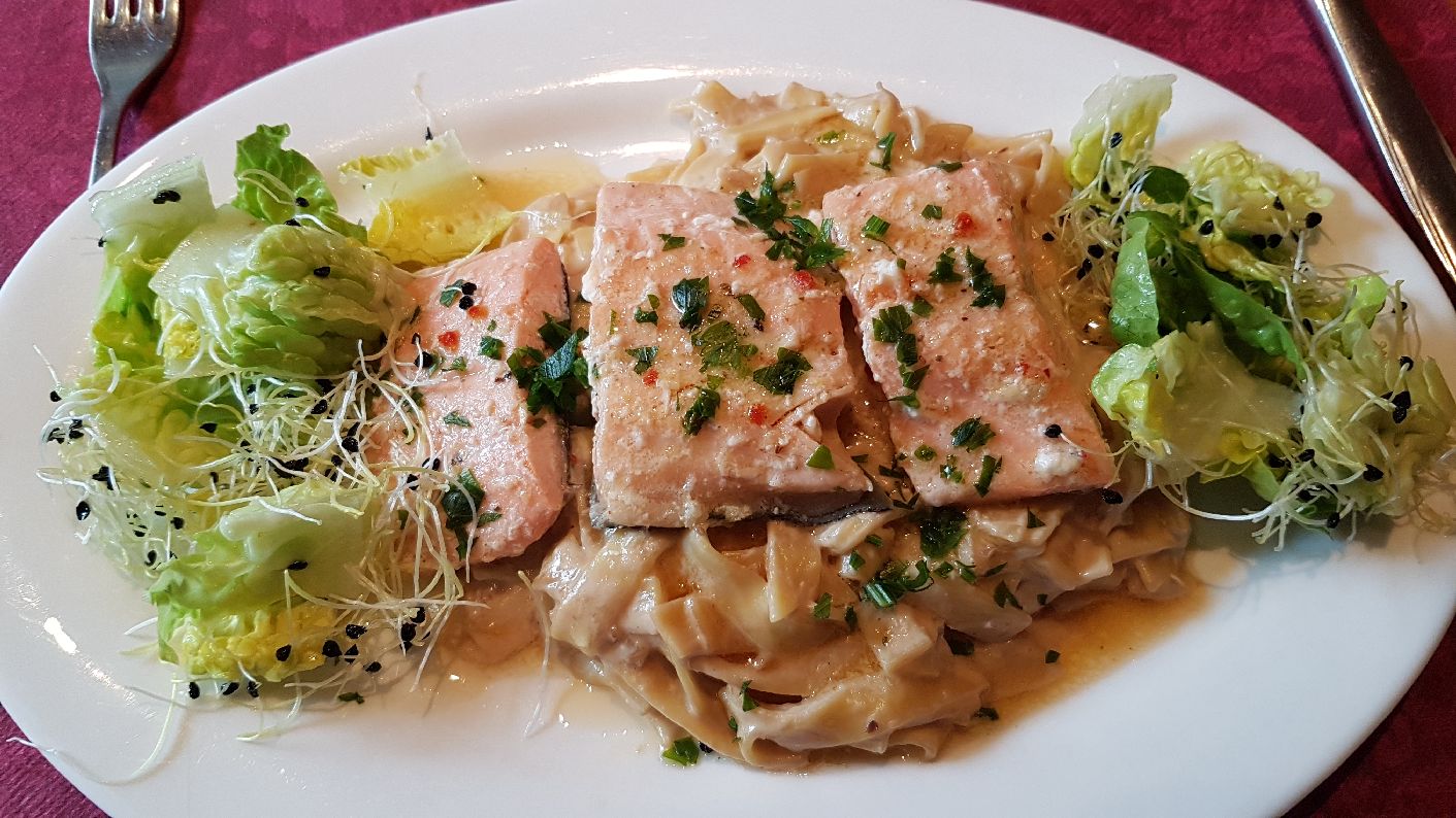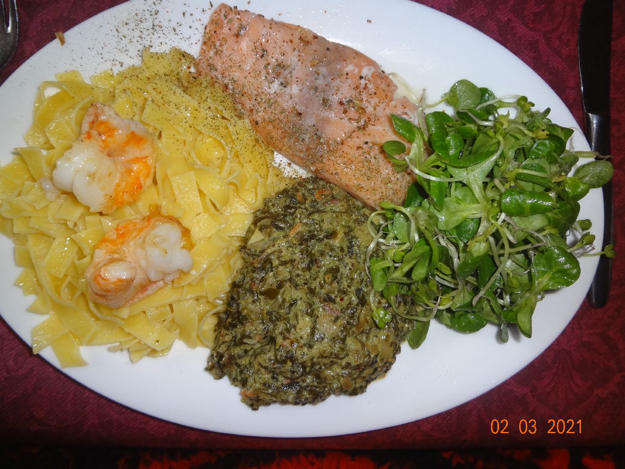 | | Geräuchertes Saibling-Filet, Tagliatelle in Spinat mit Käse-Wein-Rahm-Soße, Mini-Romana-Salat mit Sprossen |