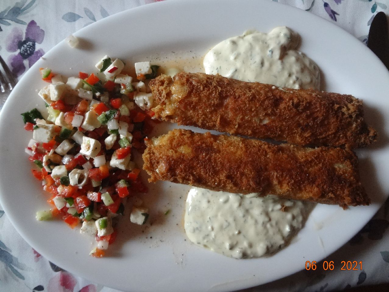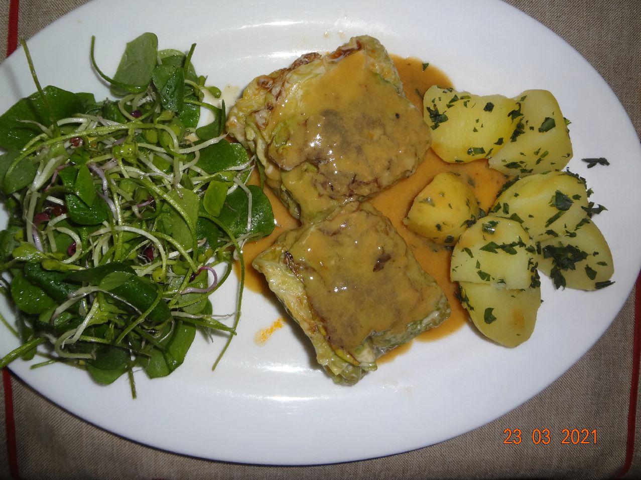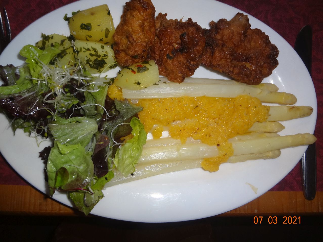 | | Paniertes Schollen-Filet, Spargel mit Bechamel-Soße, Pet.-Kart., Feldsalat mit Sprossen |