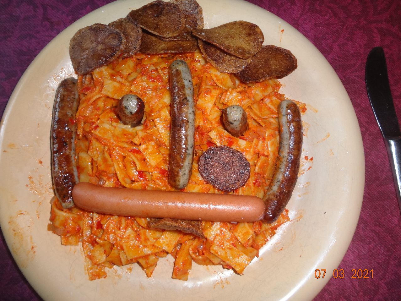 | | Wurst-Ragout aus Mini-Käse-Krainern, gebutterte Tagliatelle mit Grana-padana, Brokkoli mit Mandelsplittern, Gemüse-Salat mit Mozzarella |