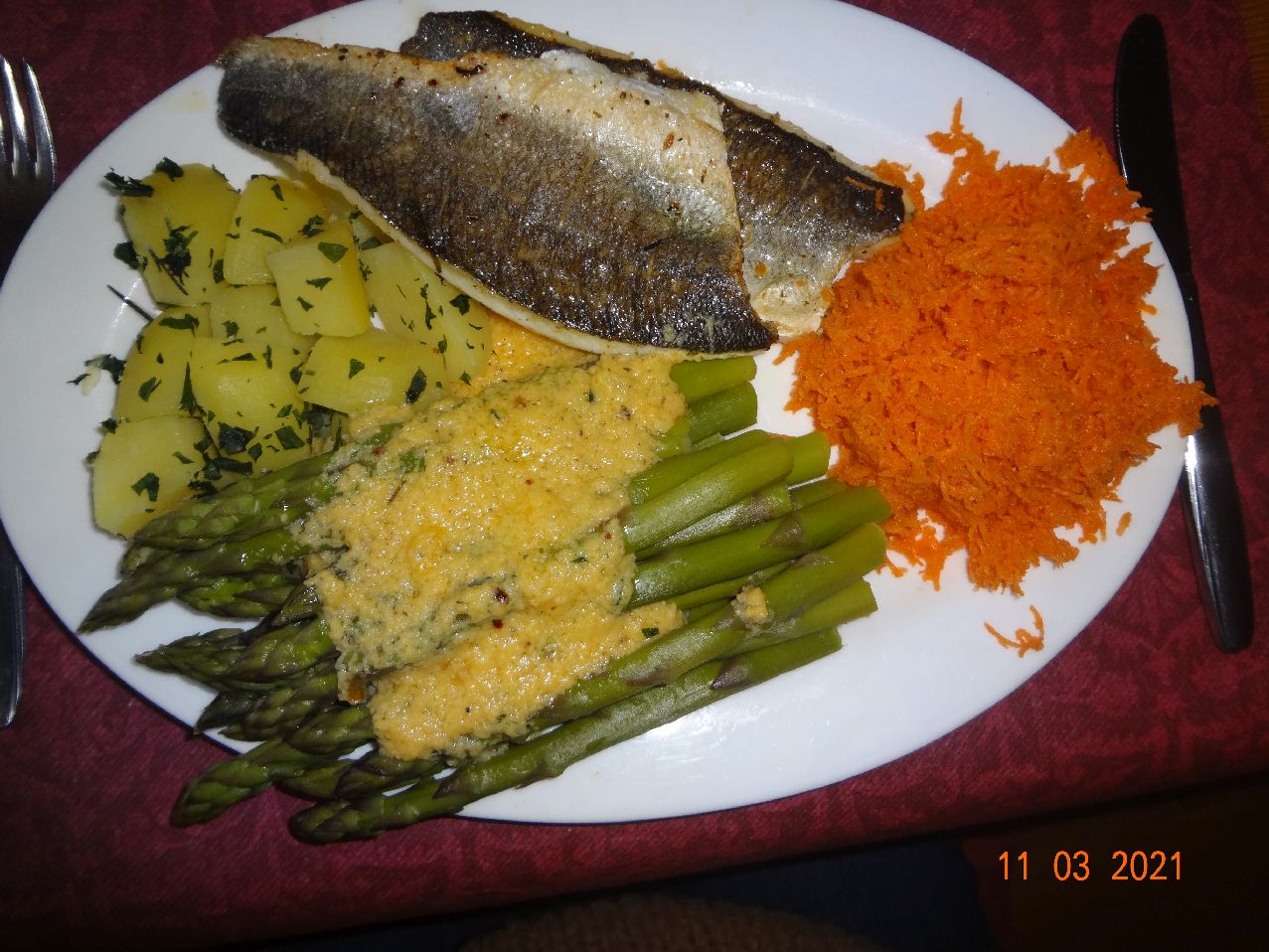 | | Gebratenes Wolfsbarsch-Filet, grüner Spargel mit holländischer Soße, Möhrensalat |