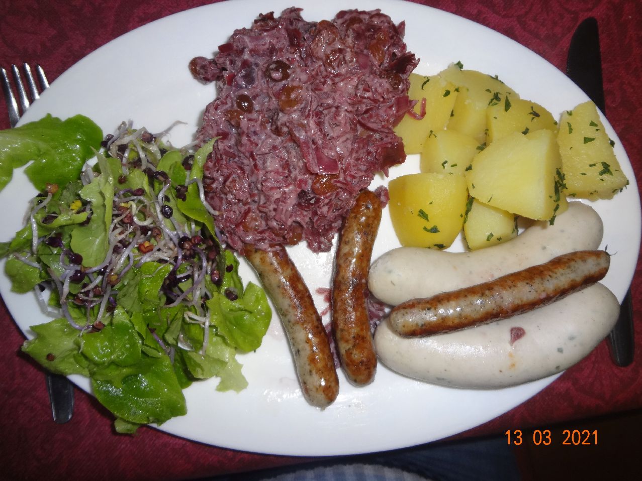 | | Nürnberger Bratwürstchen, Münchner Weißwurst, Rotkohl mit Rum-Rosinen, Pet.-Kart., Salatrio mit Sprossen |