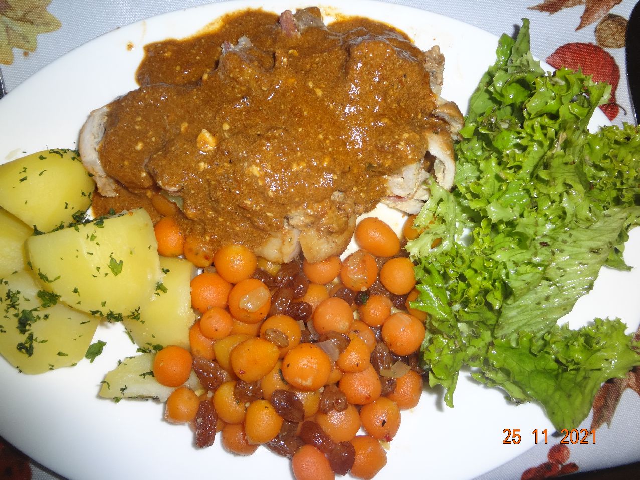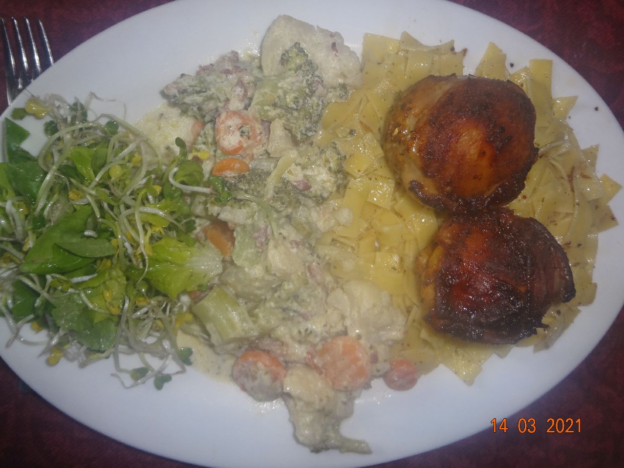 | | Selbstgeräucherte filetierte Hähnchen-Schenkel, gemischtes Gemüse in Wein-Rahm-Soße, Pet.-Kart., Crunchy-Salat mit Sprossen |
