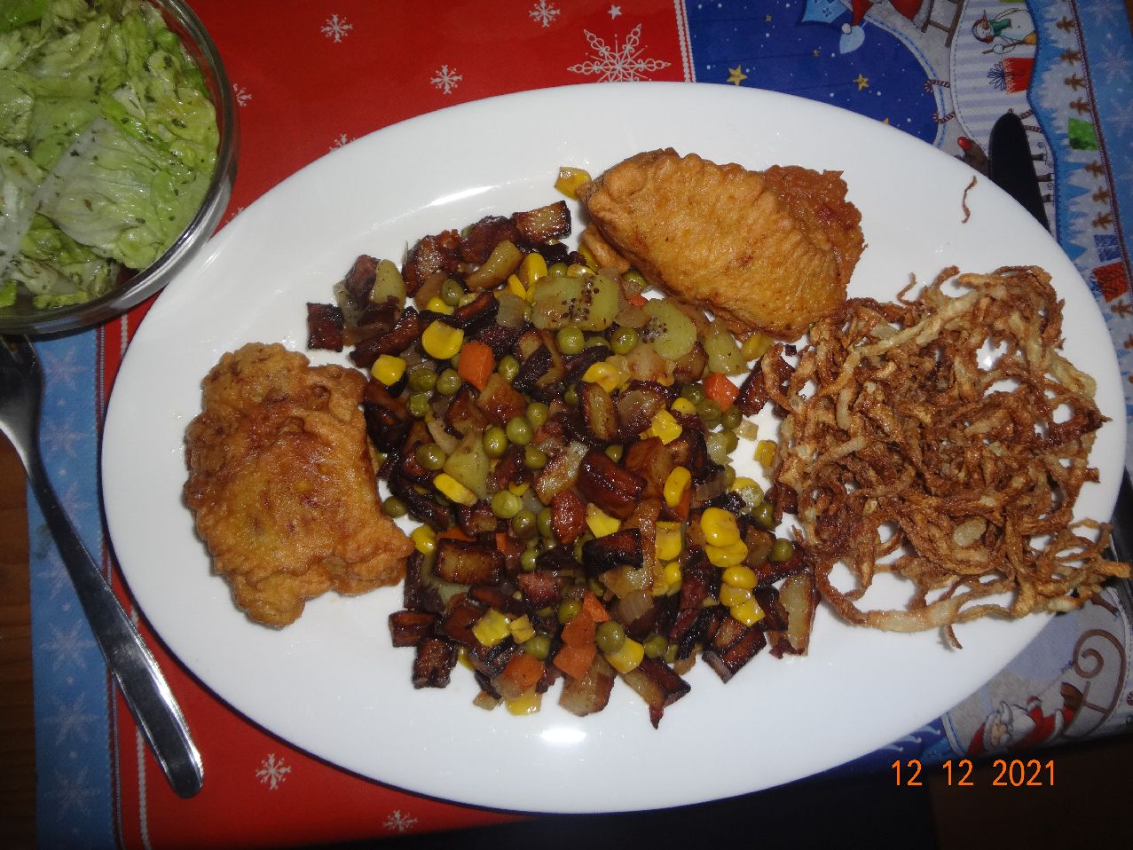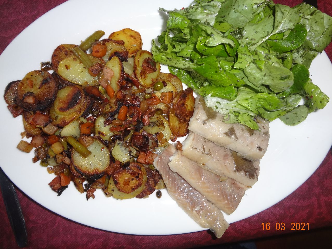 | | Bratkartoffeln mit Asia-Gemüse, Rum-Rosinen, Brathering, Salatrio |
