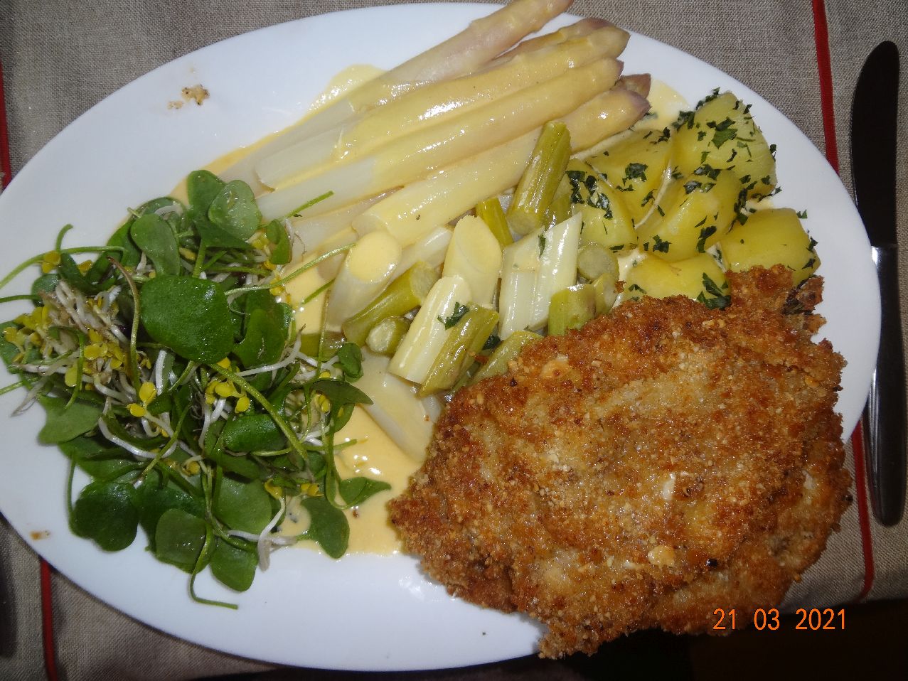 | | Schweine-Schnitzel mit Nußpanade, Spargel mit holländischer Soße, Pet.-Kart., Portulak-Salat mit Sprossen |