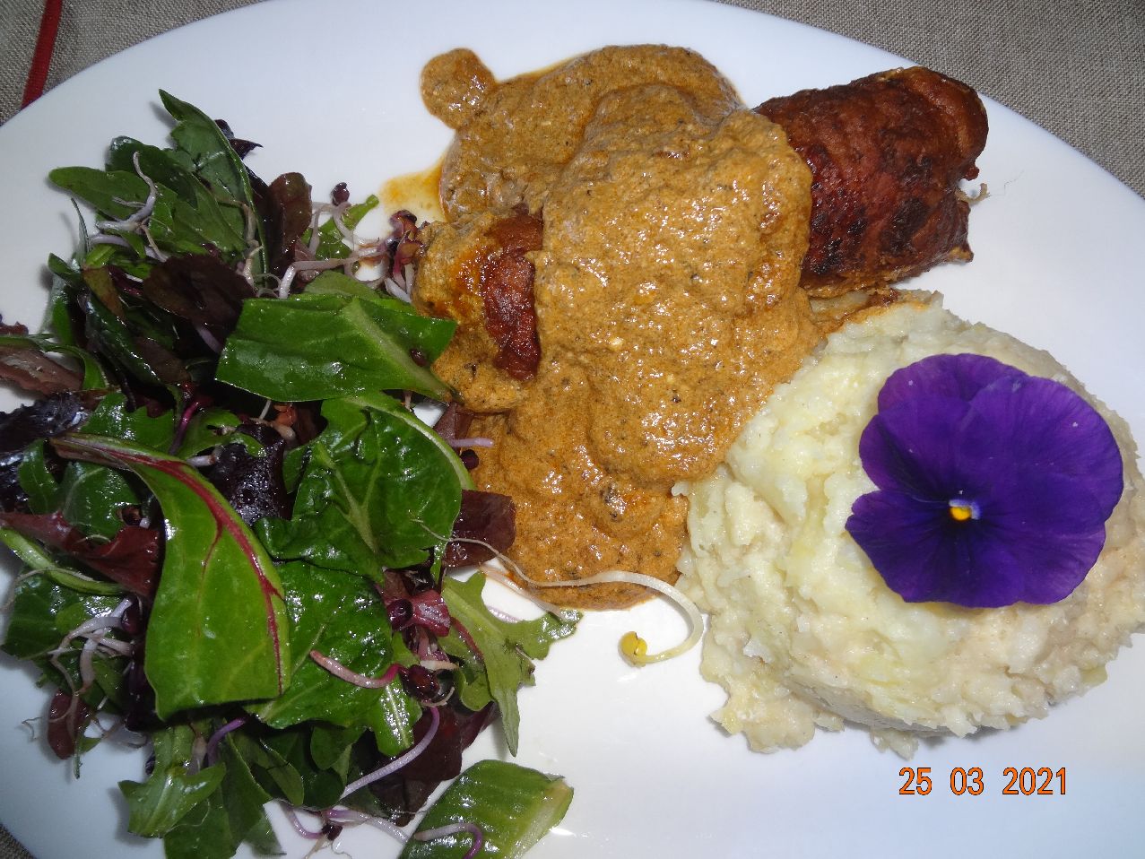 | | Schweine-Rouladen mit Kartoffel-Pastinaken-Stampf mit Blüte, Foglia-Salat |