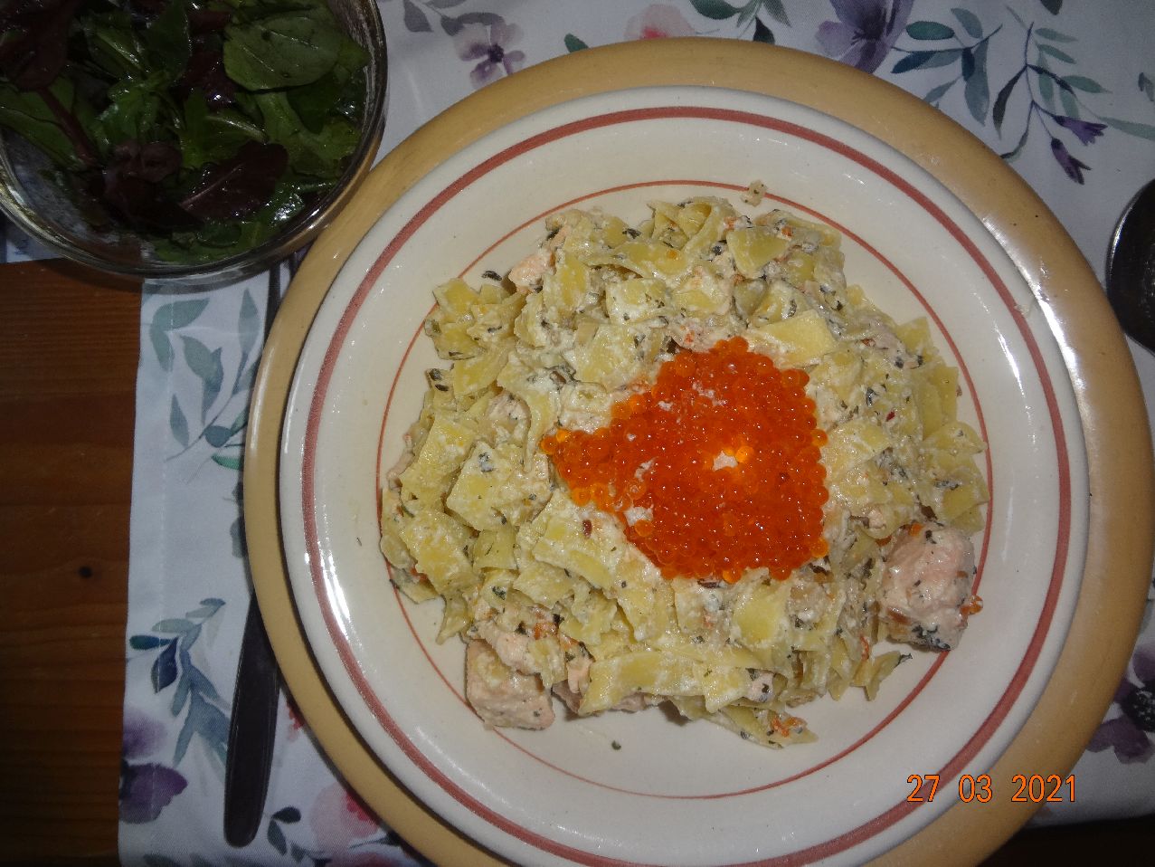 | | Nudeln mit Lachs, Kaviar, Foglia-Salat |