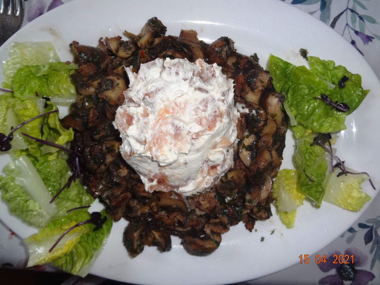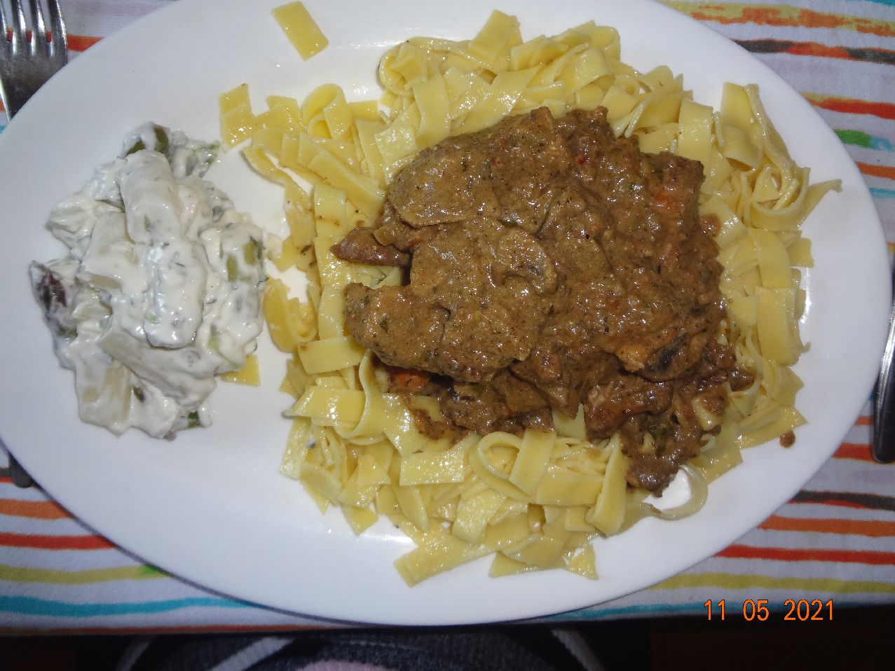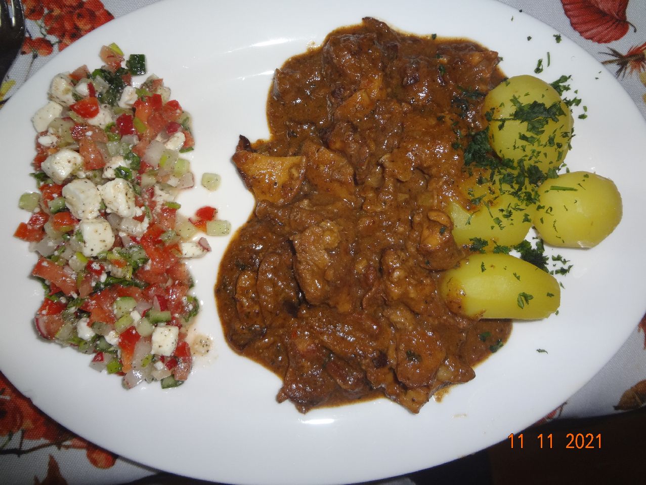 | | Kalb-Gulasch mit Wald-Pilzen in Steinpilz-Soße, Gemüse-Salat mit Feta |