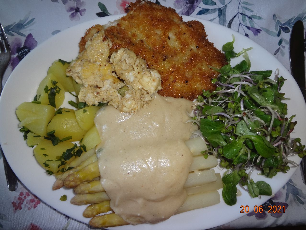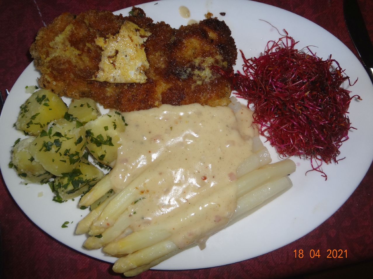 | | Hähnchen-Schnitzel, Spargel mit Bechamel-Soße, Pet.-Kart., Rote-Bete-Sprossen |