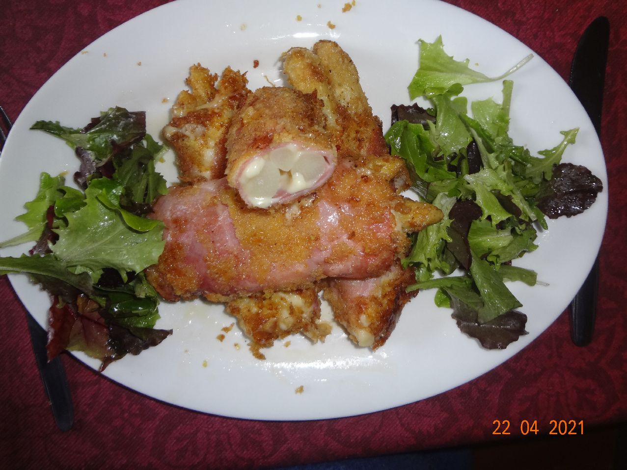 | | Hähnchen im Schlafrock, Spargel mit holländischer Soße, Salatherzen |