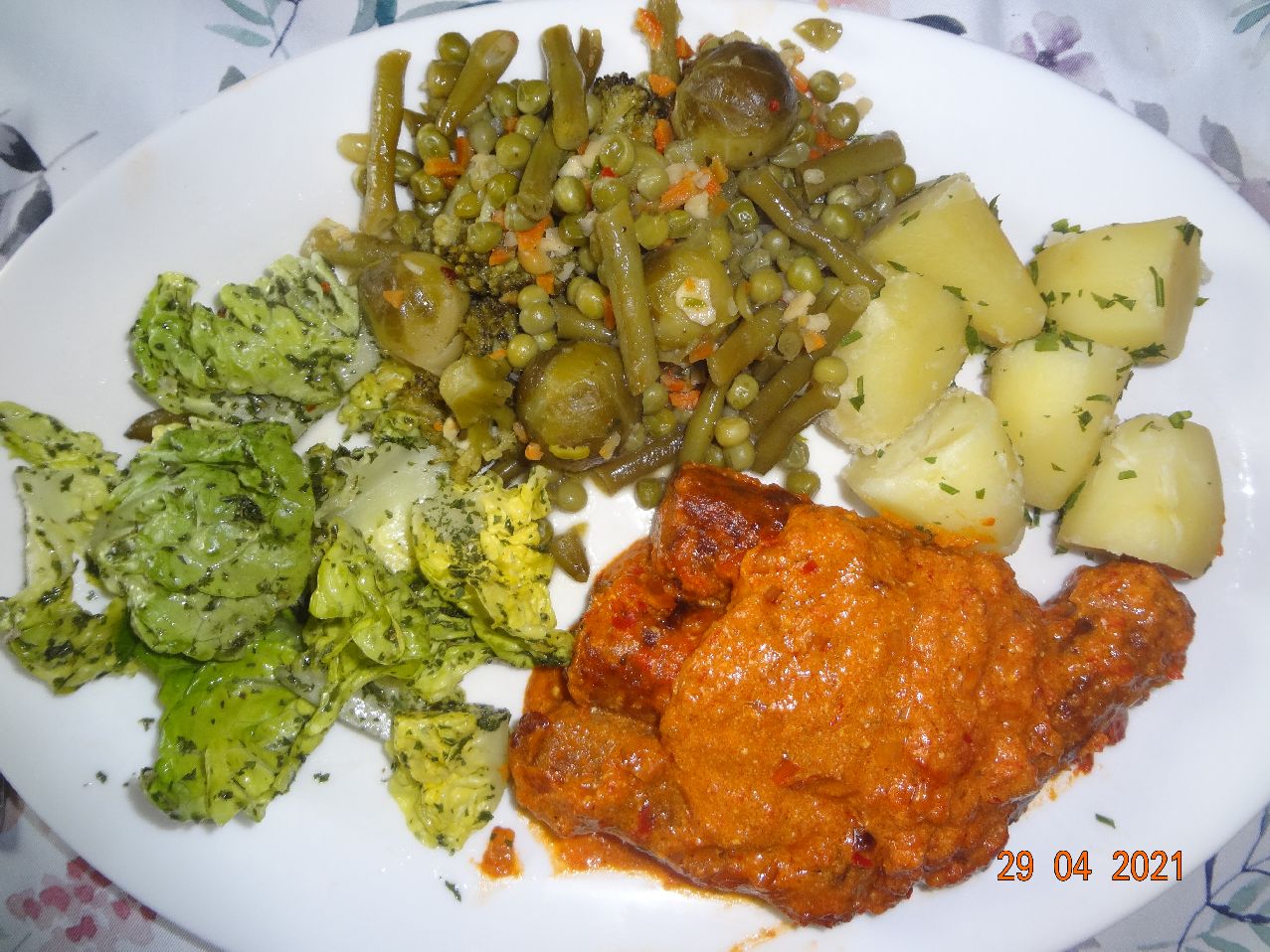 | | Schweine-Filet-Ragout in Ajvar-Schmand-Soße, gedämpftes Mischgemüse, Pet.-Kart., Crispana-Salat mit Kräutern, Dattel-Balsam(*) |