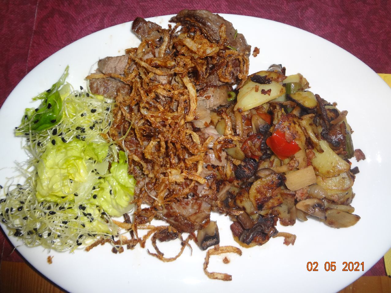 | | Entrecôte mit fritierten Zwiebeln, Bratkartoffeln mit Champignons, Gemüse-Mischung, Salatherzen mit Knoblauch-Sprossen |